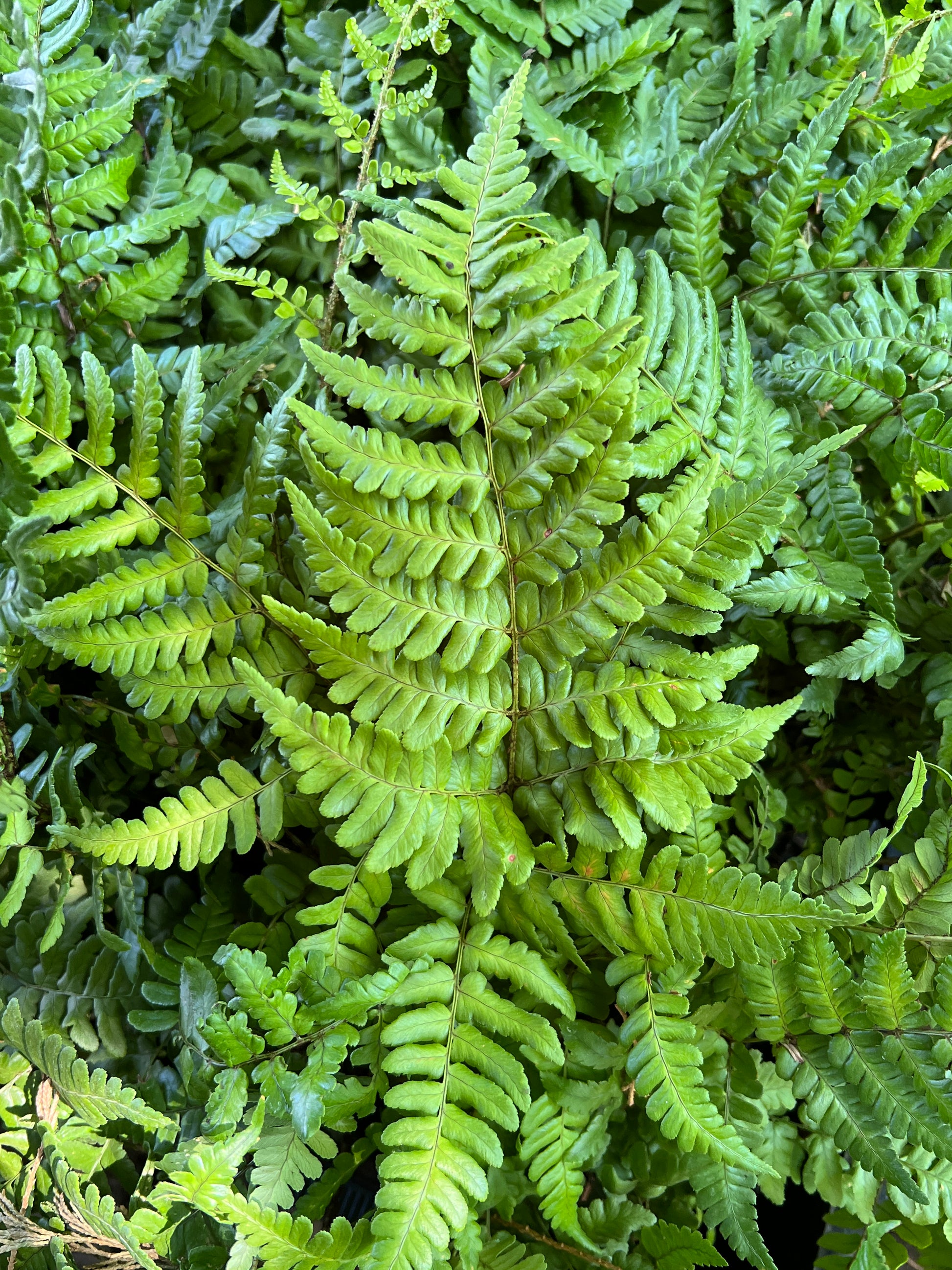Zweifach gefiederte, aufrechte und dunkelgrüne Wedel. Diese sind obrseits auffällig glänzend. Im Austrieb zunächst mit silberweißem Flaum. Später sind die neuentwickelten Blätter apfelgrün. Immergrün. Tolle und sltene Art aus China, Japan und Korea.