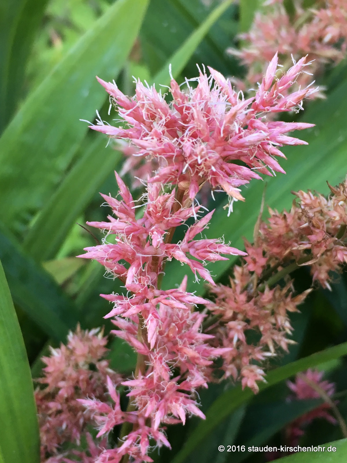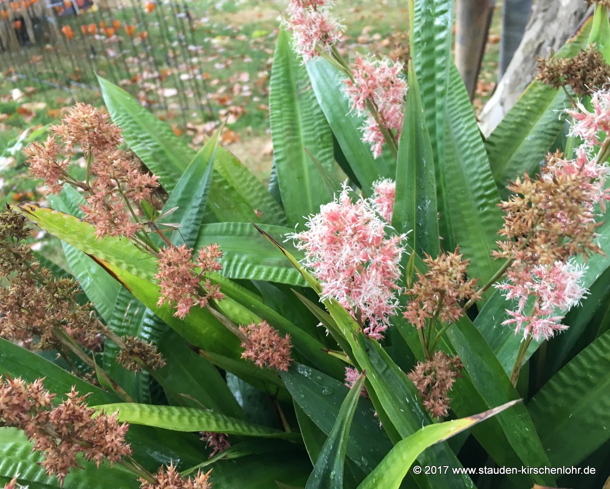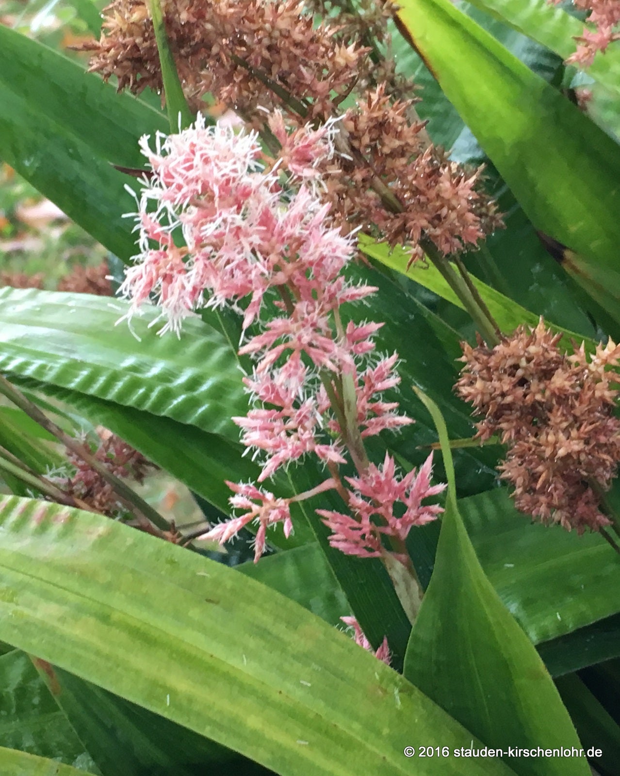 Bräunlichrosa Blütenrispen. 3 bis 4 cm breites, grünes Laub lanzettliches Laub; schräg aufwärts gerichtet. Kommt aus Yunnan.
