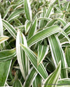 Gelbbraune Blütenrispen. Auffällig breites grünes Laub mit weißem Rand. Schräg aufwärts gerichtete Blätter sind sommergrün. Schöne, zierliche Form von 'Variegata'.