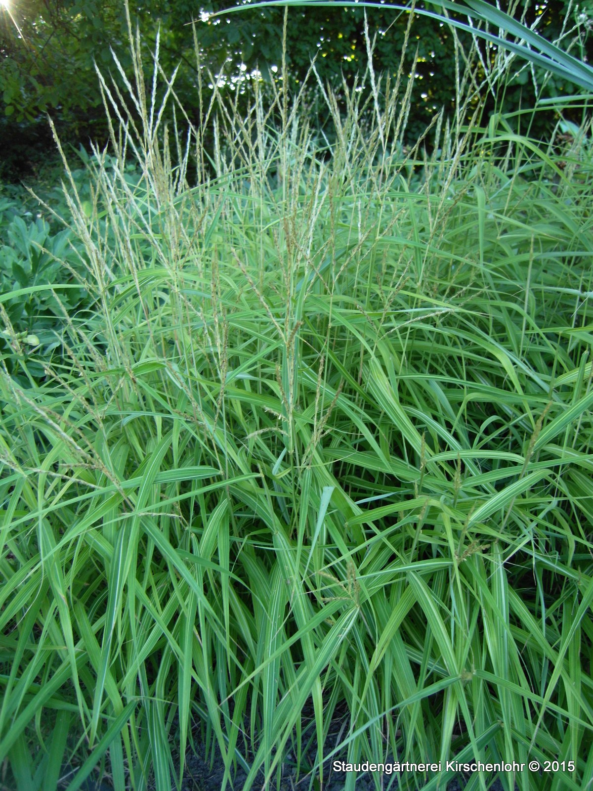 Braunliche weiße Blüten in aufrechten Rispen. Lineares, zugespitzes Laub mit weißbunter Längszeichnung. Sehr wirkungsvoll. Bildet kurze Ausläufer. Sommergrün.