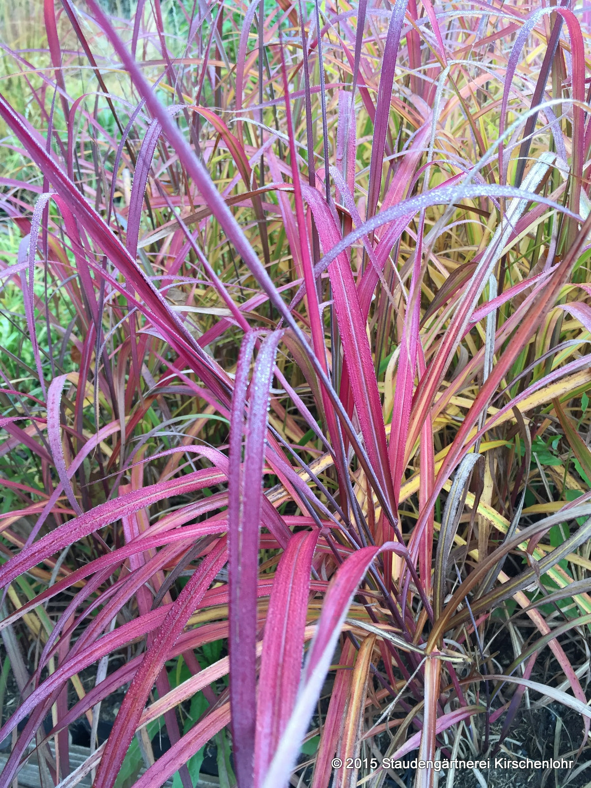 Braunrote Blütenähren später dann silbrig. Breite, olivgrüne, stark überhängende Blätter. Schmaler Wuchs. Im Herbst rotbraune Laubfärbung. Sommergün.