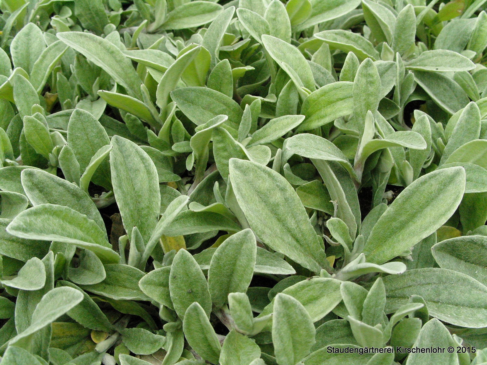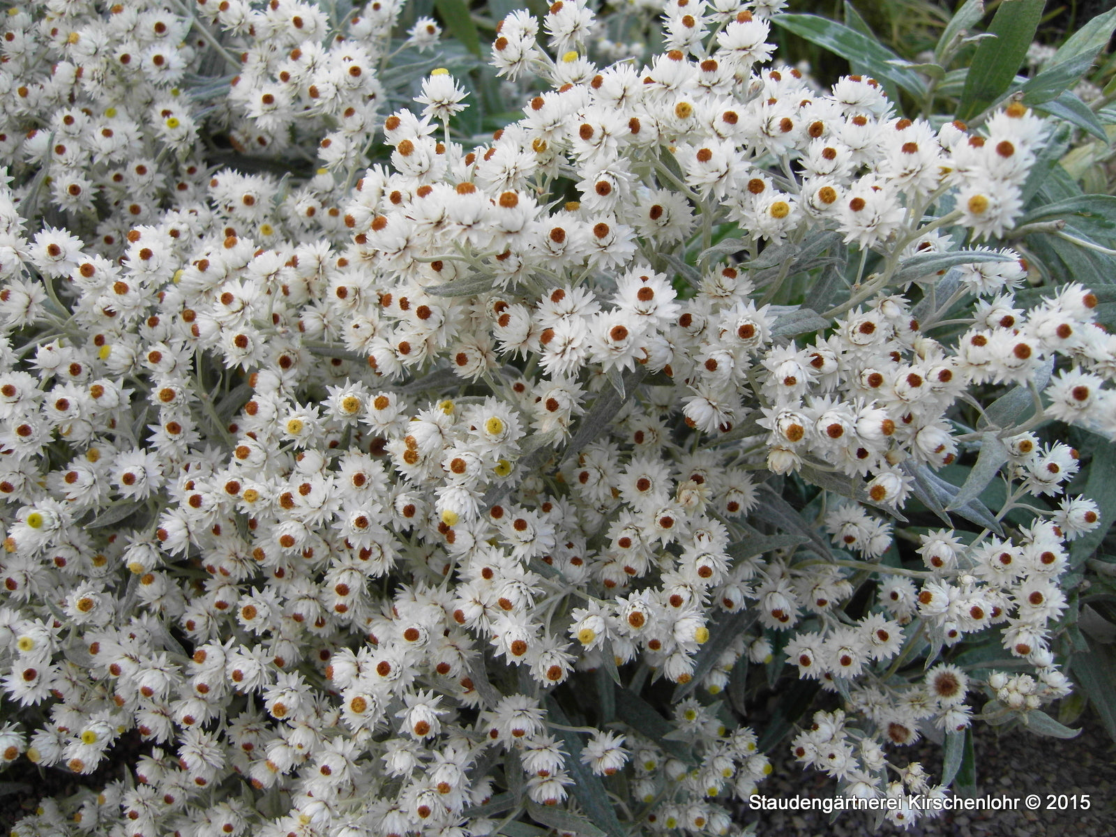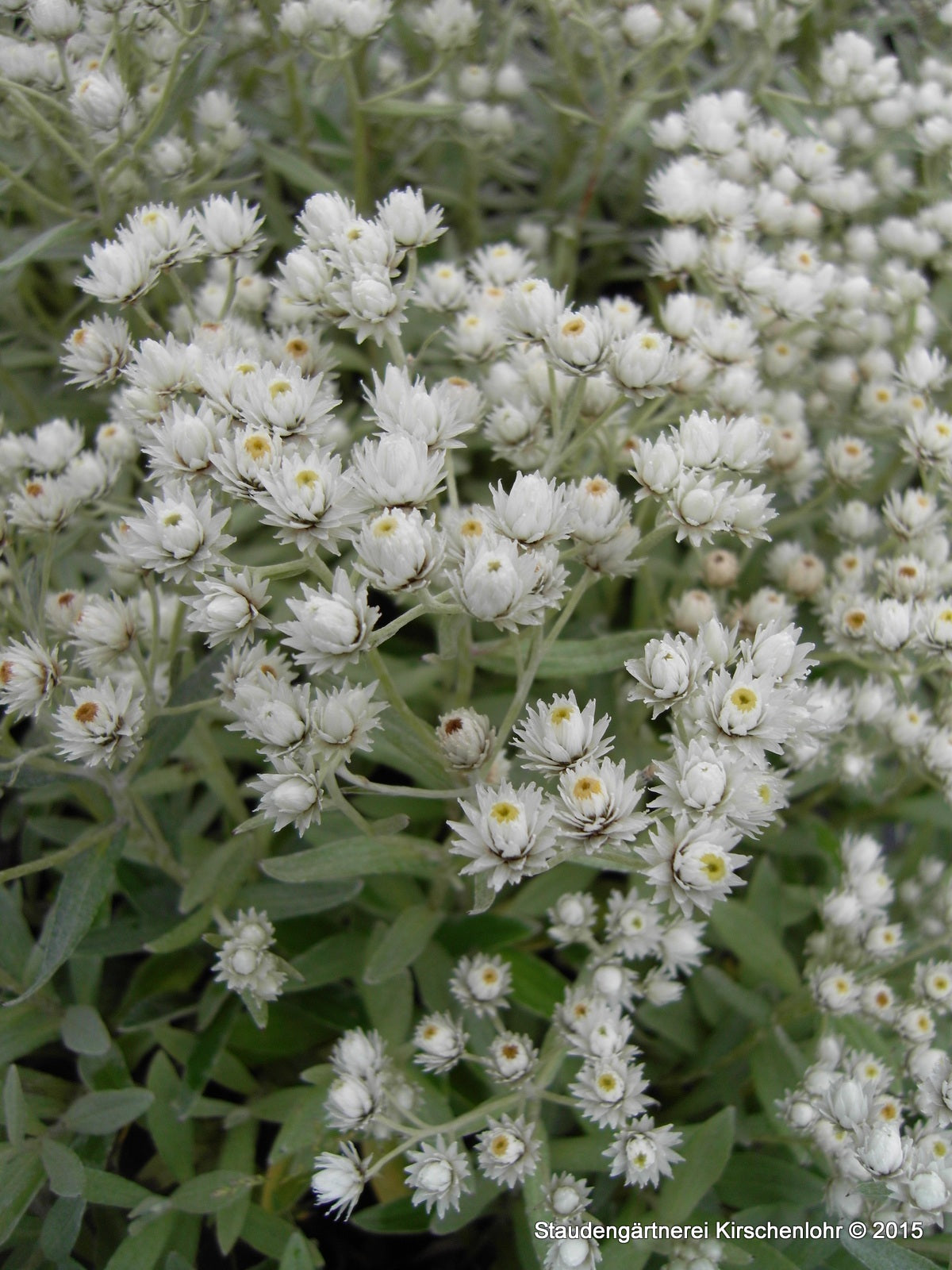 Weiße Blütchen welche an das einer Strohblume erinnern. Lanzettliche, filzige, graugrüne Blätter. Tolerante Staude. Lange Blütezeit.