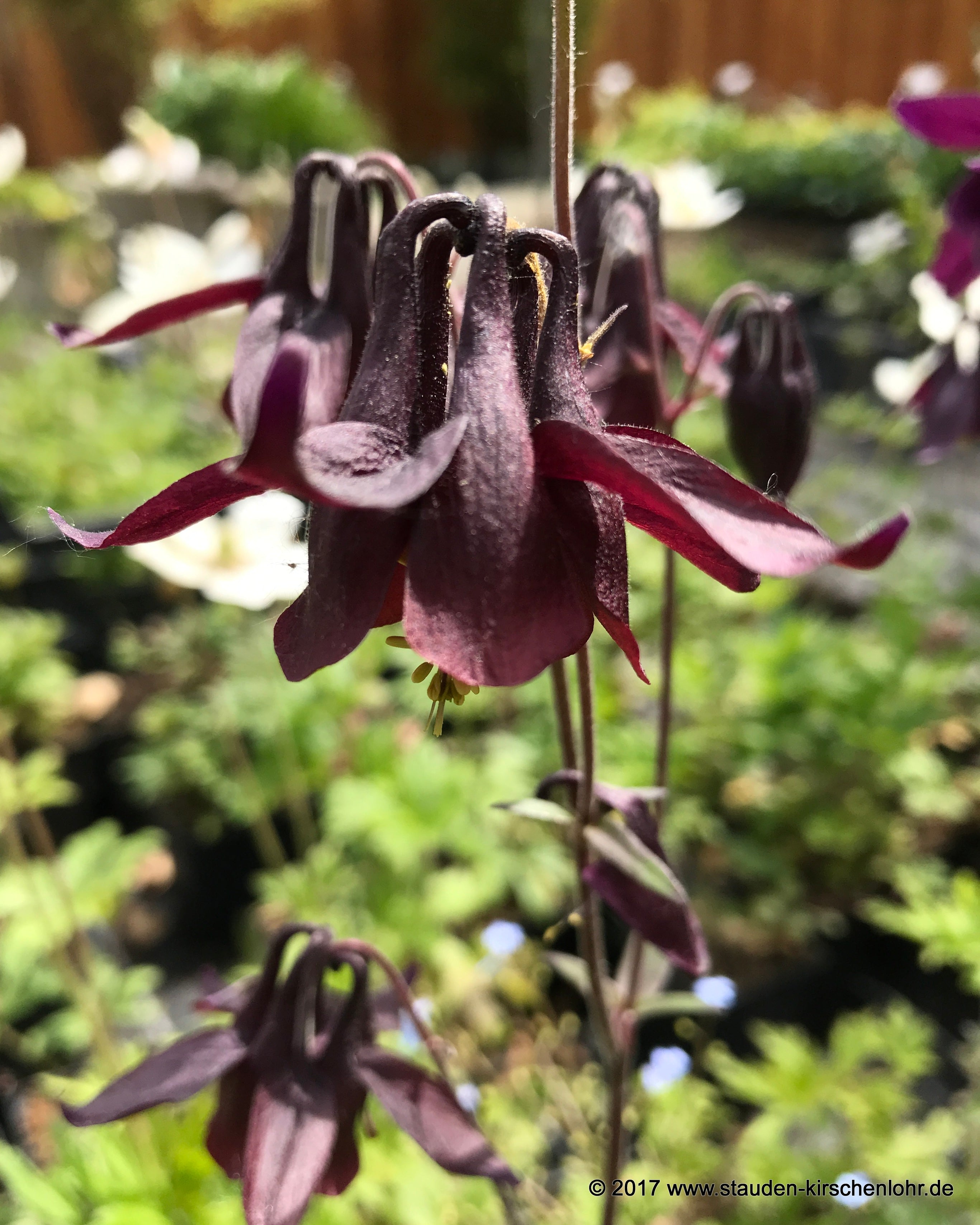 Schwarzrote bis schwarzviolette Blüten mit gekrümmten Spornen. Stängel ästig verzweigt Blütenstände über dem Laub. In Abschnitte geteilte Blätter.
