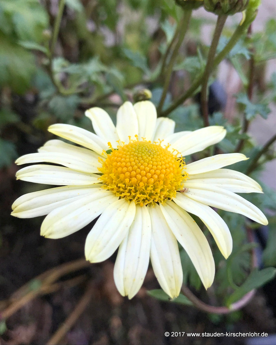 Schwefelgelbe Margeritenblüten, die im Verblühen verblassen. Schönes Farbenspiel. Rundliche, gebuchtete Blätter. Wertvoller Spätblüher.