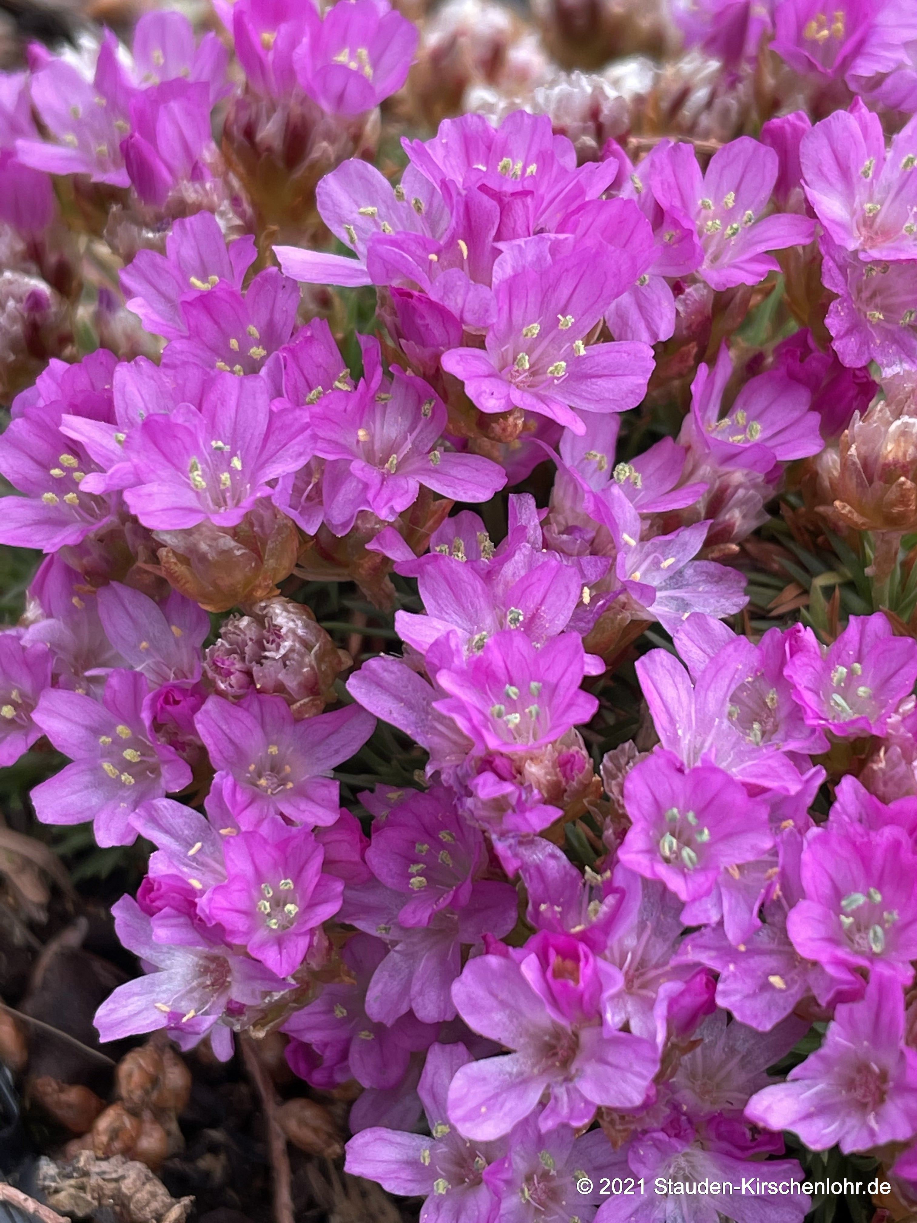Auffällige, tiefrosa, kugelige Blütenköpfchen auf kurzen Stängeln. Nadelartiges, graugrünes Laub, bildet ein dichtes, flaches Polster. Wintergrün. syn. A. juniperifolia 'Drake´s Deep Form'
