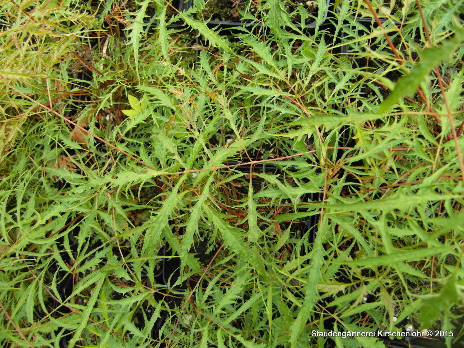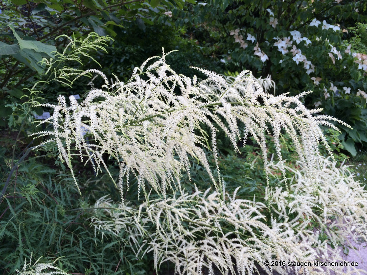 Cremeweiße Blütenrispen. Auffällig filigranes, eher feinschnittiges, tief geschlitzten Laub. Langsamwachsende, historische Liebhaber-Sorte.