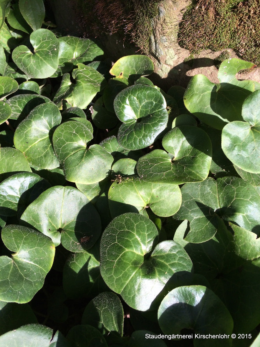 Rotbraune, unscheinbare Blüten. Nierenförmige, lederartige, wintergrüne Blätter. Blattoberseite schön glänzend. Liebt kalkreiche Böden. Winter- bis immergrün.