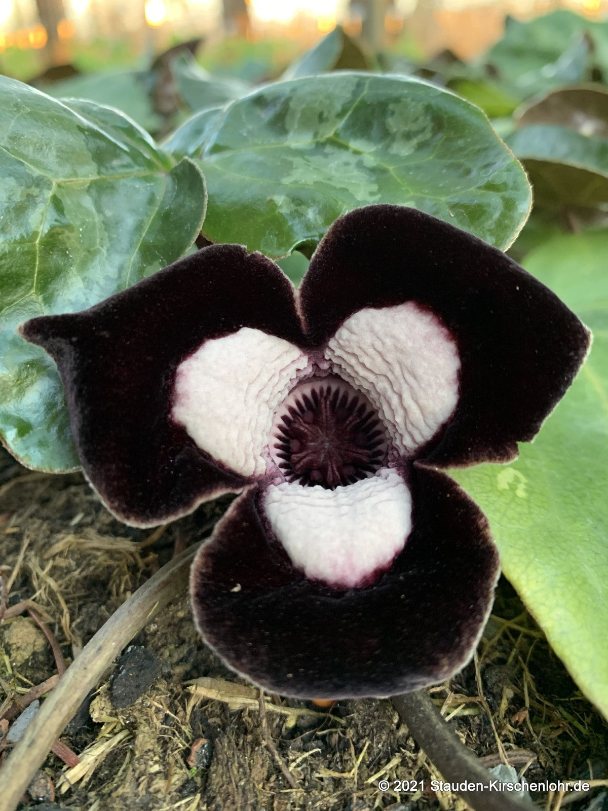 Große schwarzbraune Blüten mit hellbraune Augenzone. Sehr große, glänzende, ledrige, sattgrüne Blätter mit silbriger Zeichnung. Wintergrün.