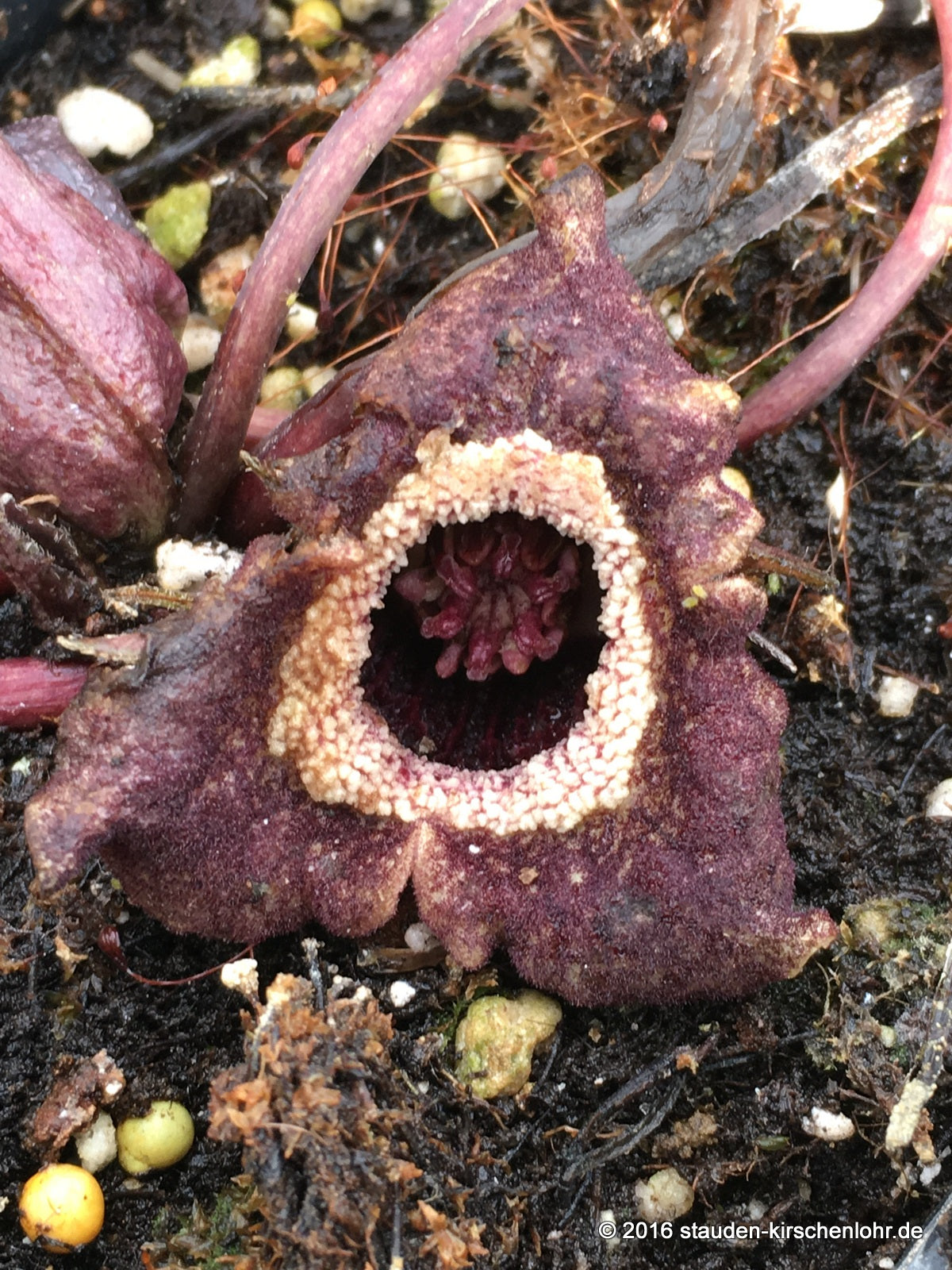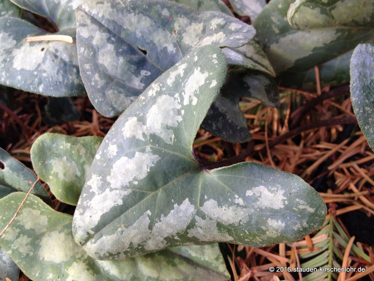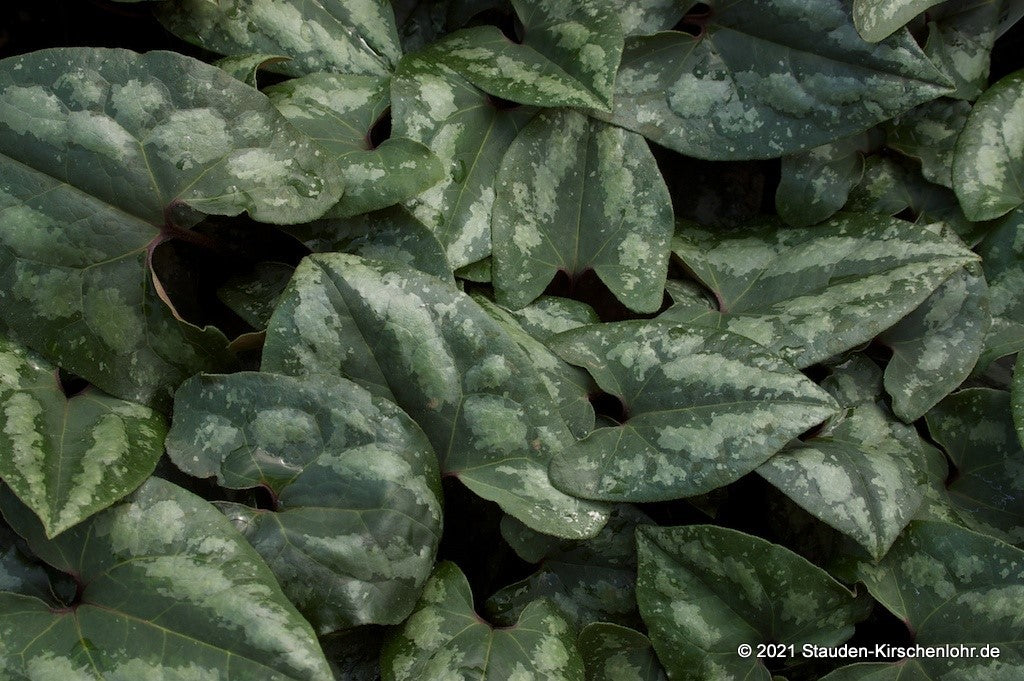 Große, zweitonig braune Blüten die sich unterm Laub verstecken. Blattschmuckstaude mit pfeilförmigen, dunkelgrünen, silberg gefleckten Blättern. Wintergrün.
