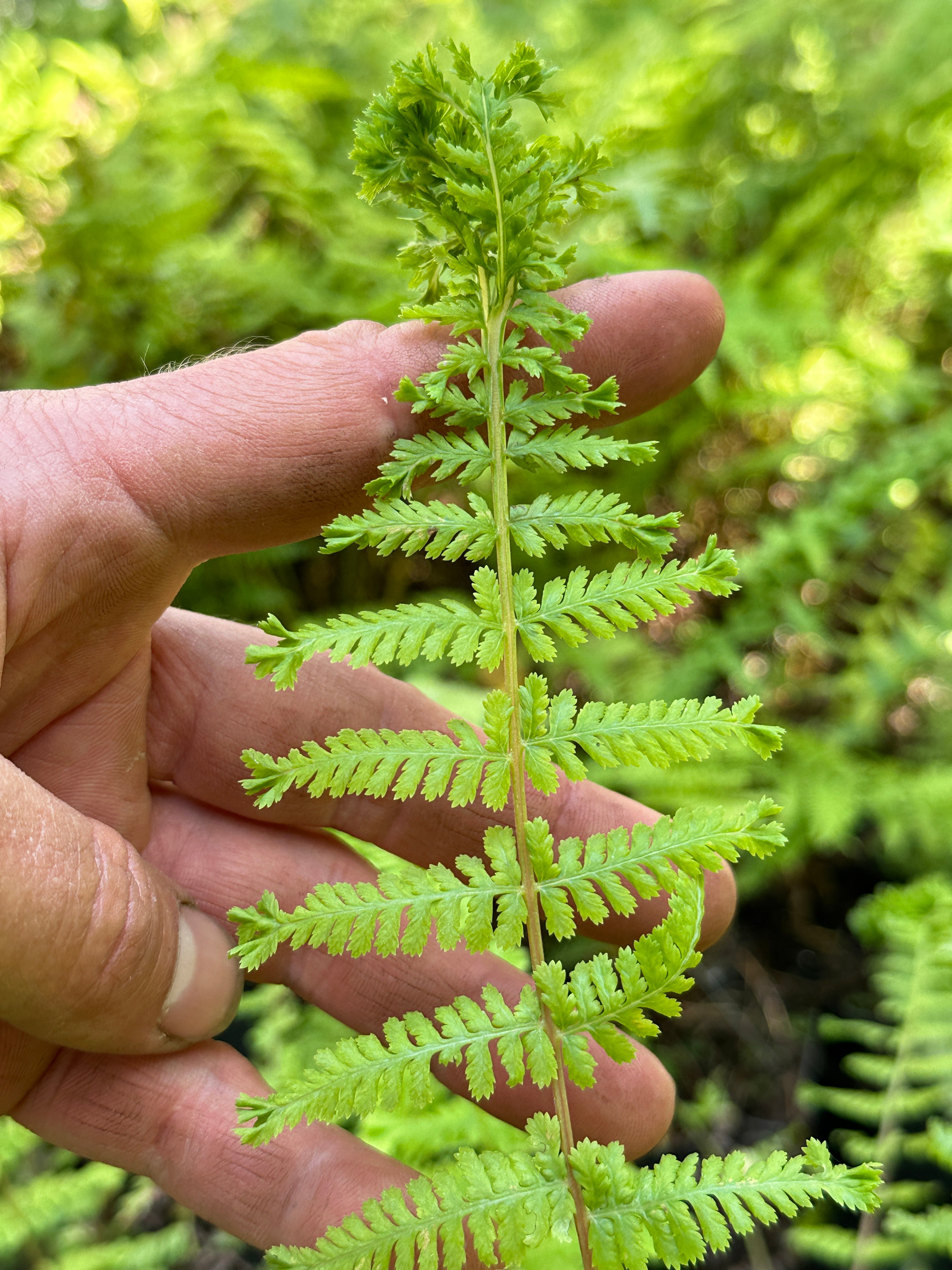 Rote Stiele und Mittelrippen. Die Wedelenden haben einen großen Troddelkopf und erinnern an Petersilie! Interessante und sehr seltene Form von 'Rotstiel'.