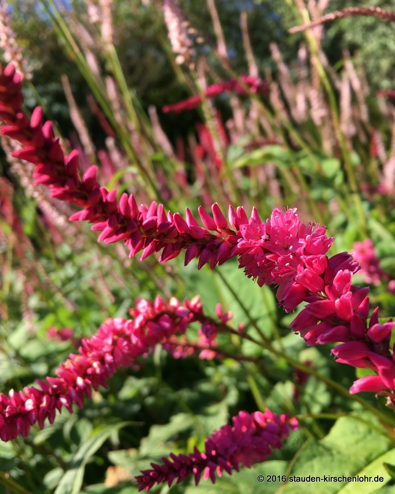 Leuchtend himbeerrosa Blüten an leicht nickenden, dicken Scheinähren. Besonders leuchtende Farbe. Breitlanzettliche Blätter. Spitzensorte von Chris Ghyselen (B).