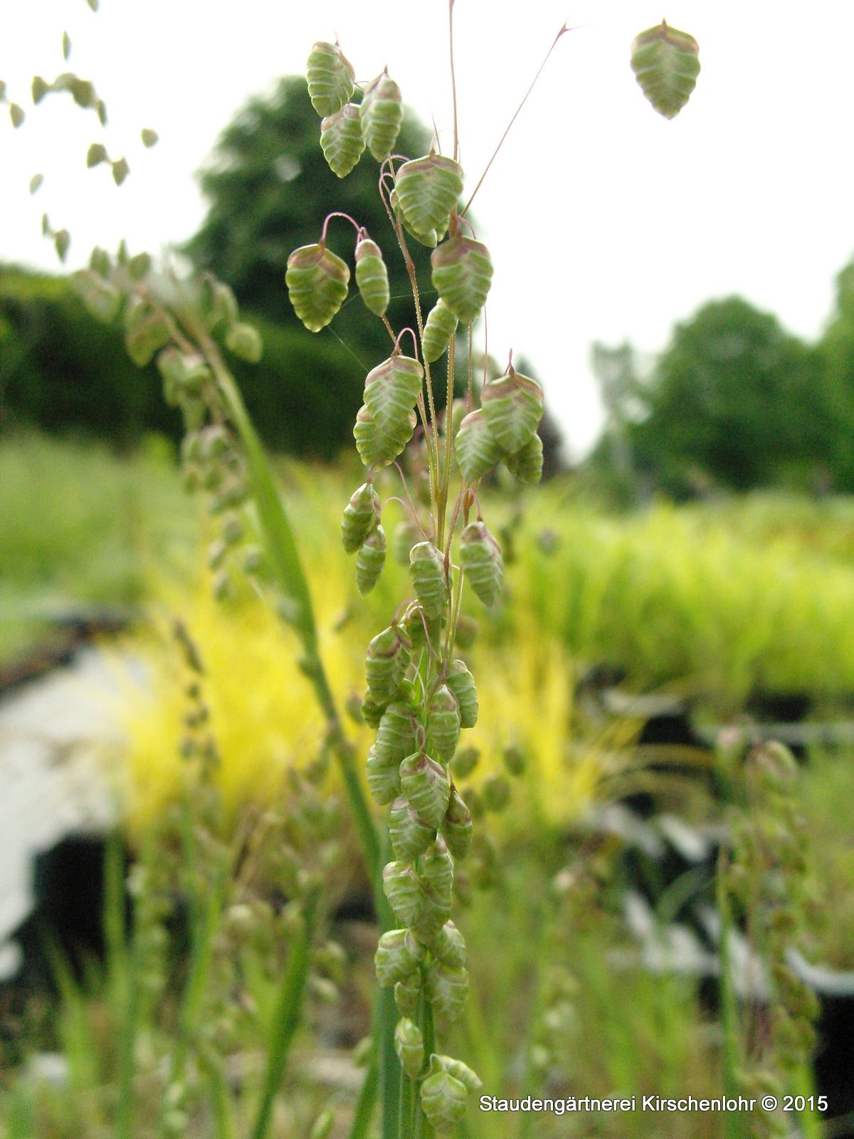 Große, herzförmige Ähren welche sich beim geringsten Windhauch in Bewegung versetzen. Auch das Laub ist breiter als bei der Art. Dichtes grünes Graspolster.