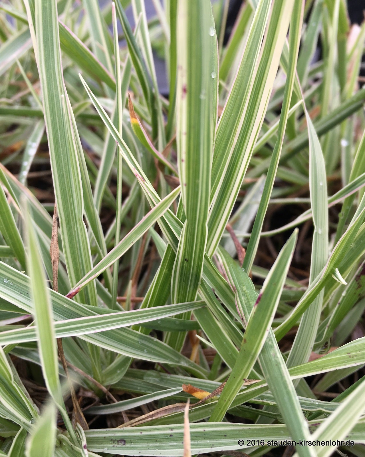 Auch diese Sorte hat herzförmige Ähren. Die Besonderheit liegt am weiß-grünen, lineal, zugespitzten Laub. Dichtes, grasartiges Polster. Wintergrün.