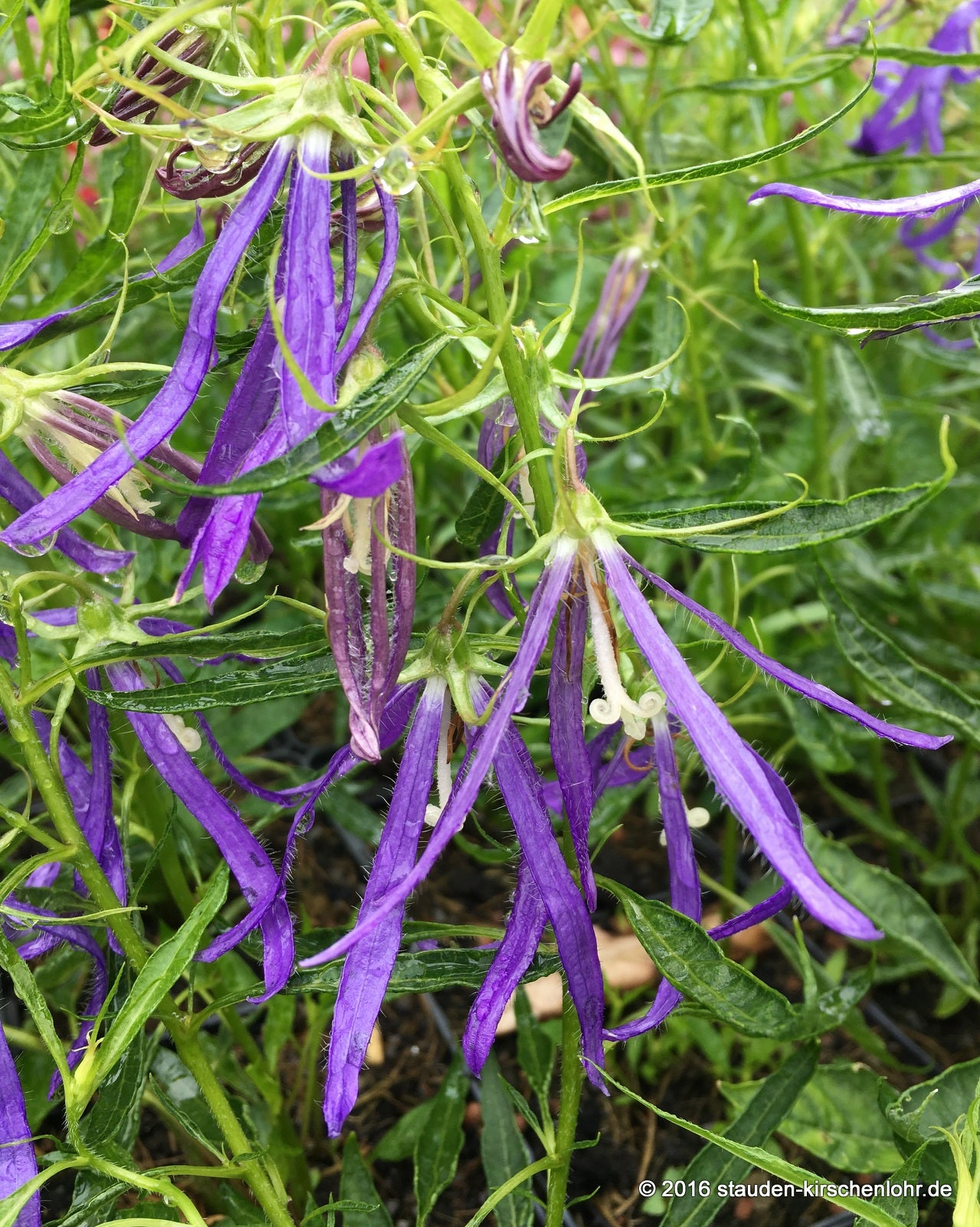 Besonders schmale, tentakelartig hängende, blaue Blütenblätter. Reichblühende Sorte! Blattränder tief gezahnt. Sommergrün.