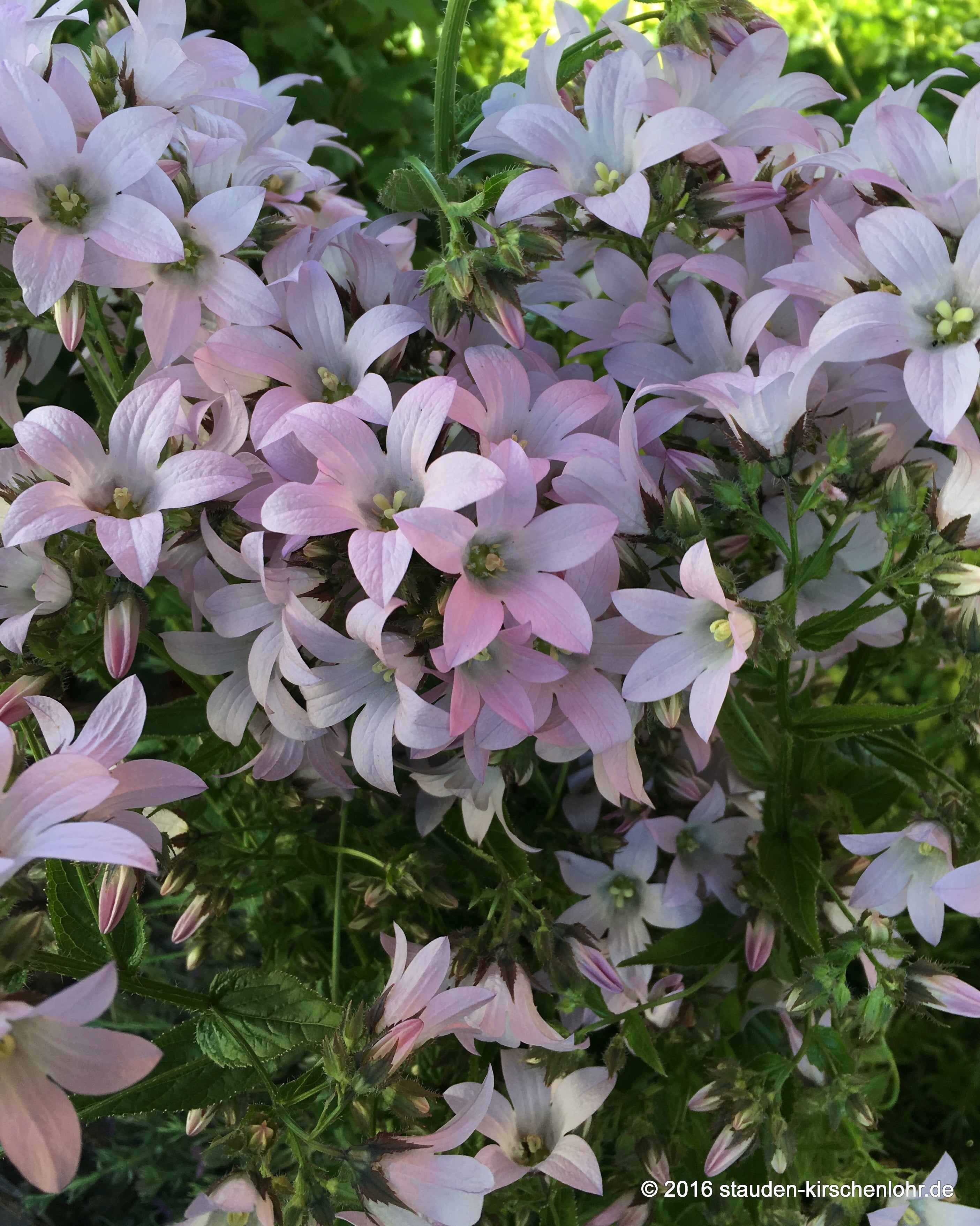 Zart lila-rosa Blüten erscheinen in bogig überhängenden, doldigenrispigem Blütenstand. Zart duftend. Frischgrüne, lanzettliche Blätter mit gesägtem Rand.
