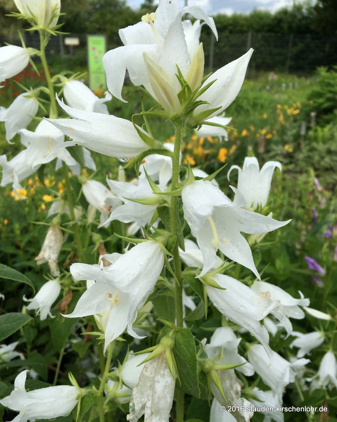 Große reinweiße Blütenglocken. Lanzettlich zugespitzte Blätter; Blattrand gesägt. In trockenen Jahren zieht sie im Sommer ein.(= Campanula latifolia subsp. latifolia 'Alba')