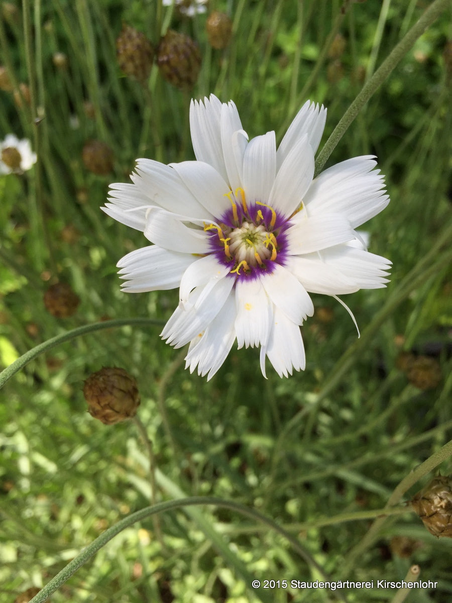 Kornblumenartige, weiße Blüten an langen Stielen. Graugrüne, lineale Blätter. Auch zum Schnitt geeignet. Toleriert trockene Standorte.