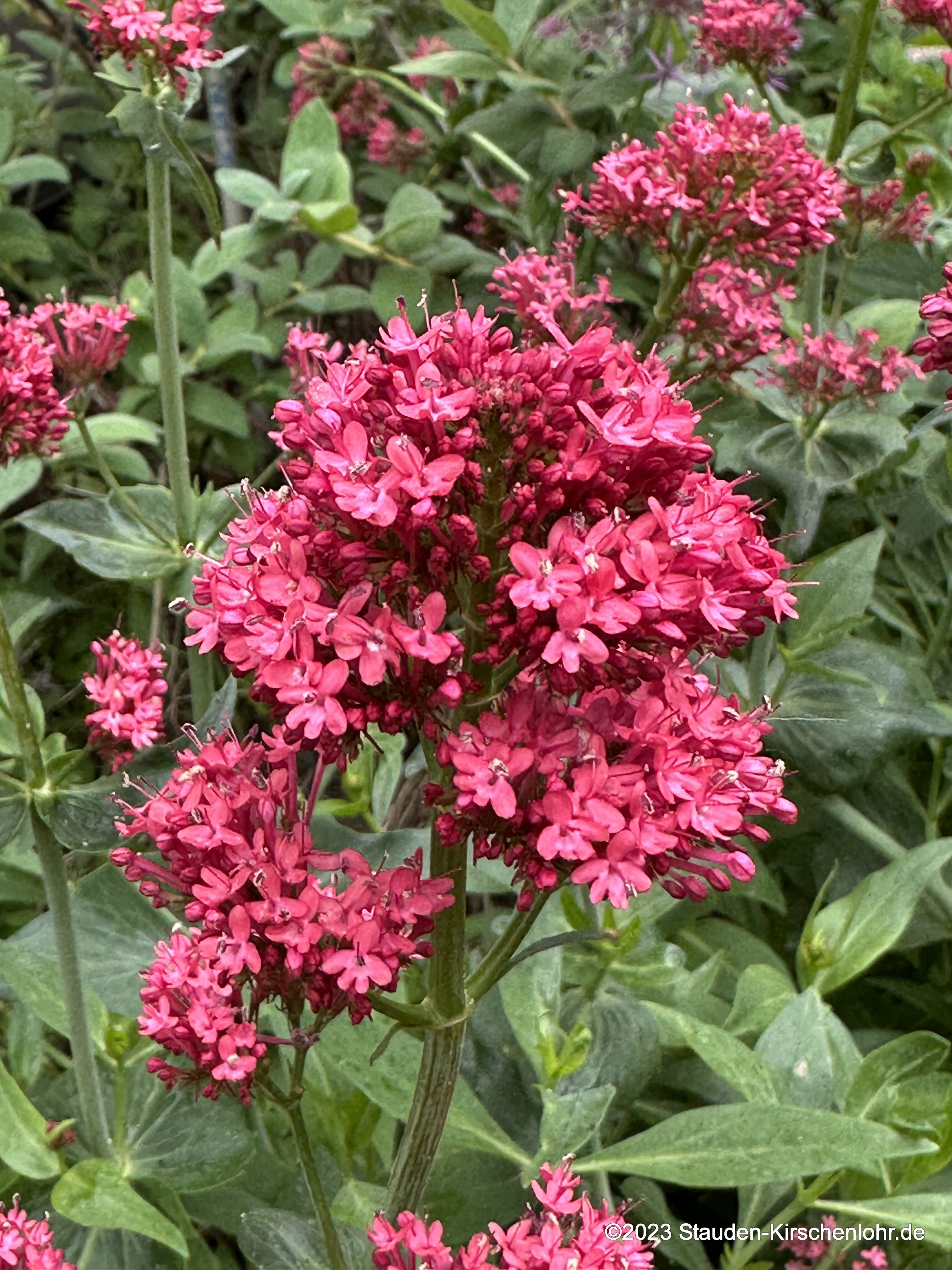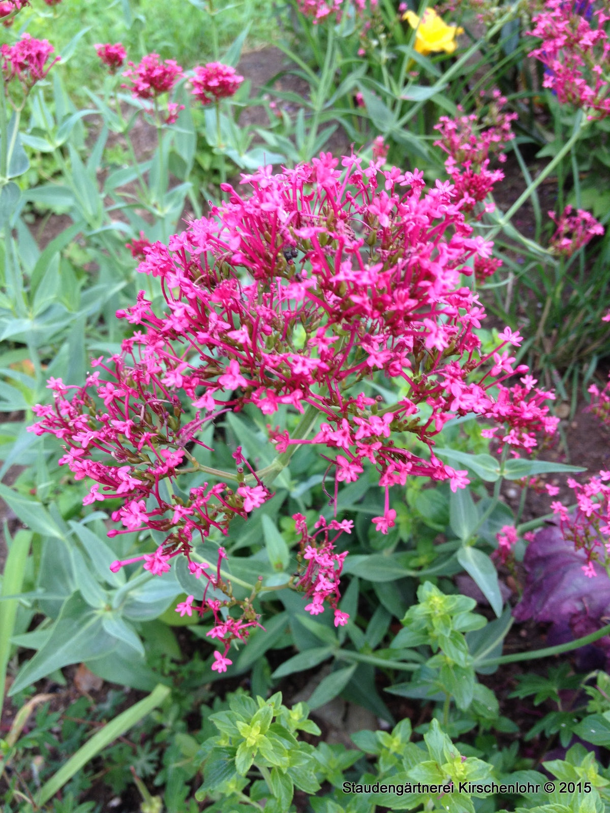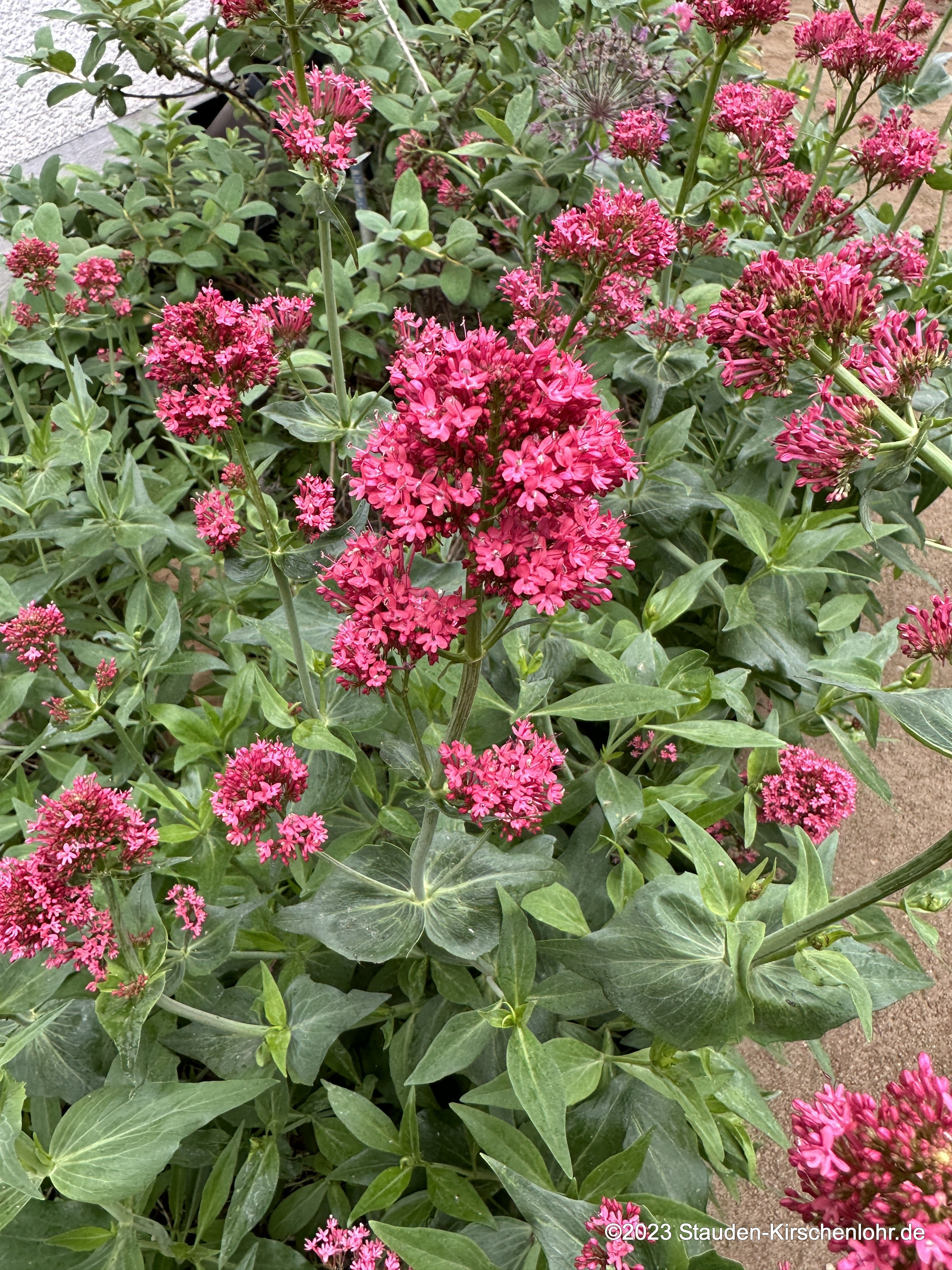 Himbeerrote, röhrige Blüten in einer Dolde angeordnet. Toleriert trockene Standorte. Breitlanzettliches, graugrünes Laub. Sehr robust und Langlebig.
