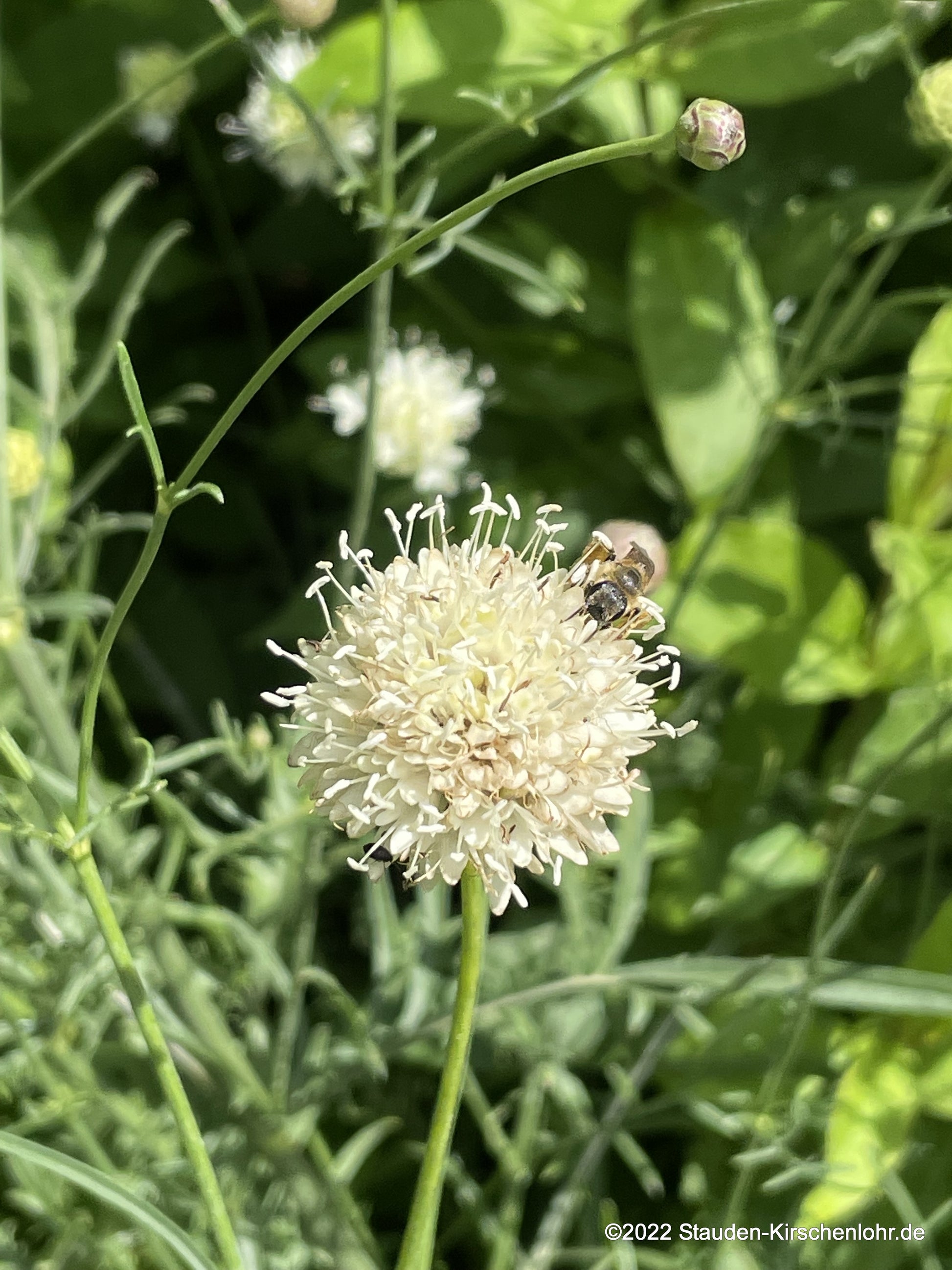 Weiße Skabiosenblüten an verzweigten Stängeln. Gefiedert, lanzettliche Blätter. l.n. Italien, Imperia, Villa Talla, 549 m.