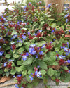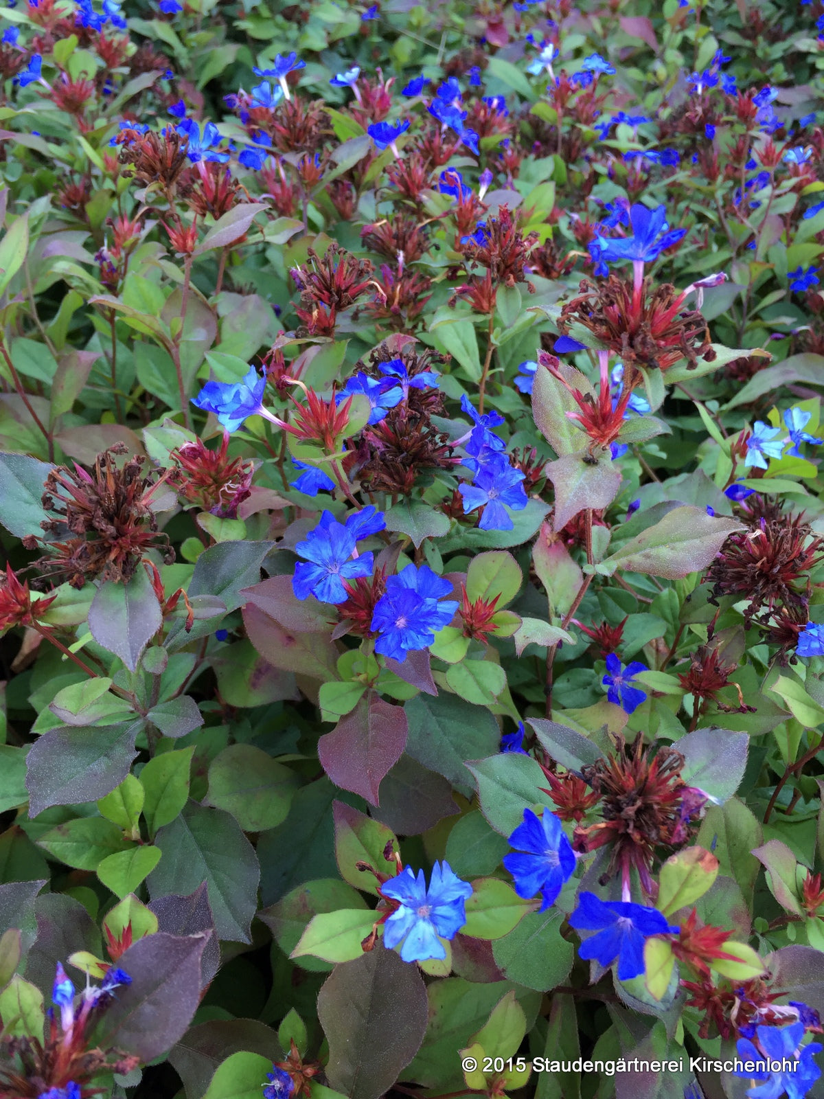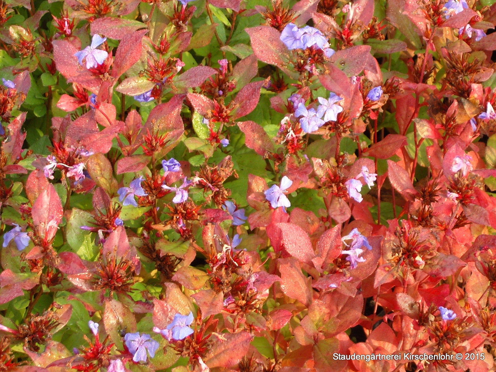 Enzianblaue Blüten. Verkehrt eiförmige Blätter. Wertvoller, absolut zuverlässiger, ausläufertreibender Bodendecker. Traumhaft, rote Herbstfärbung. Später Austrieb! Sommergrün.