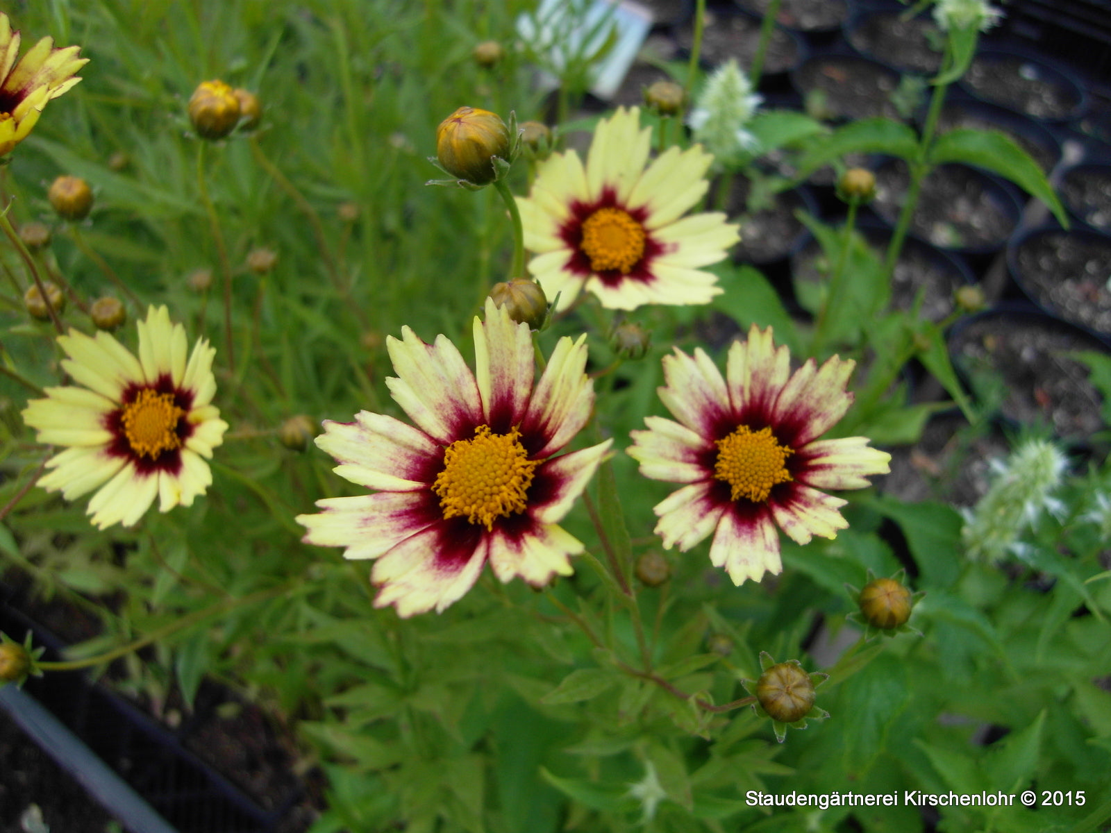 Über 6 cm große, schwefelgelbe Blüten mit auffälllig tiefroter Augenzone. Enorm reich- und langblühend. Standfest. Fantastisch und robust!