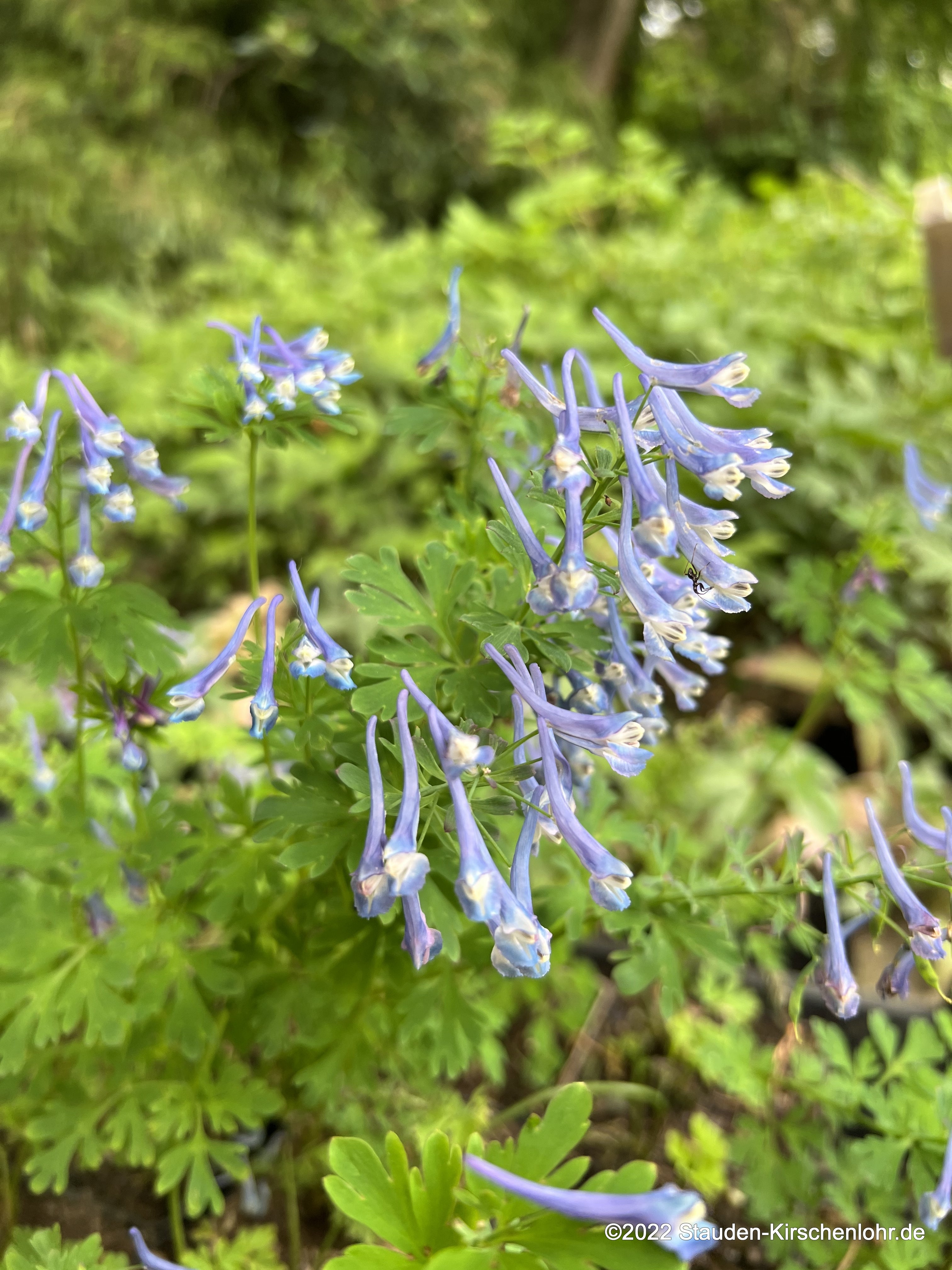 Hell indigoblaue Lippenblüten sind traubig angeordnet. Feingelapptes blaugrünes Laub. Liebt humose Böden im kühlen, luftfeuchten Gehölzschatten.