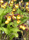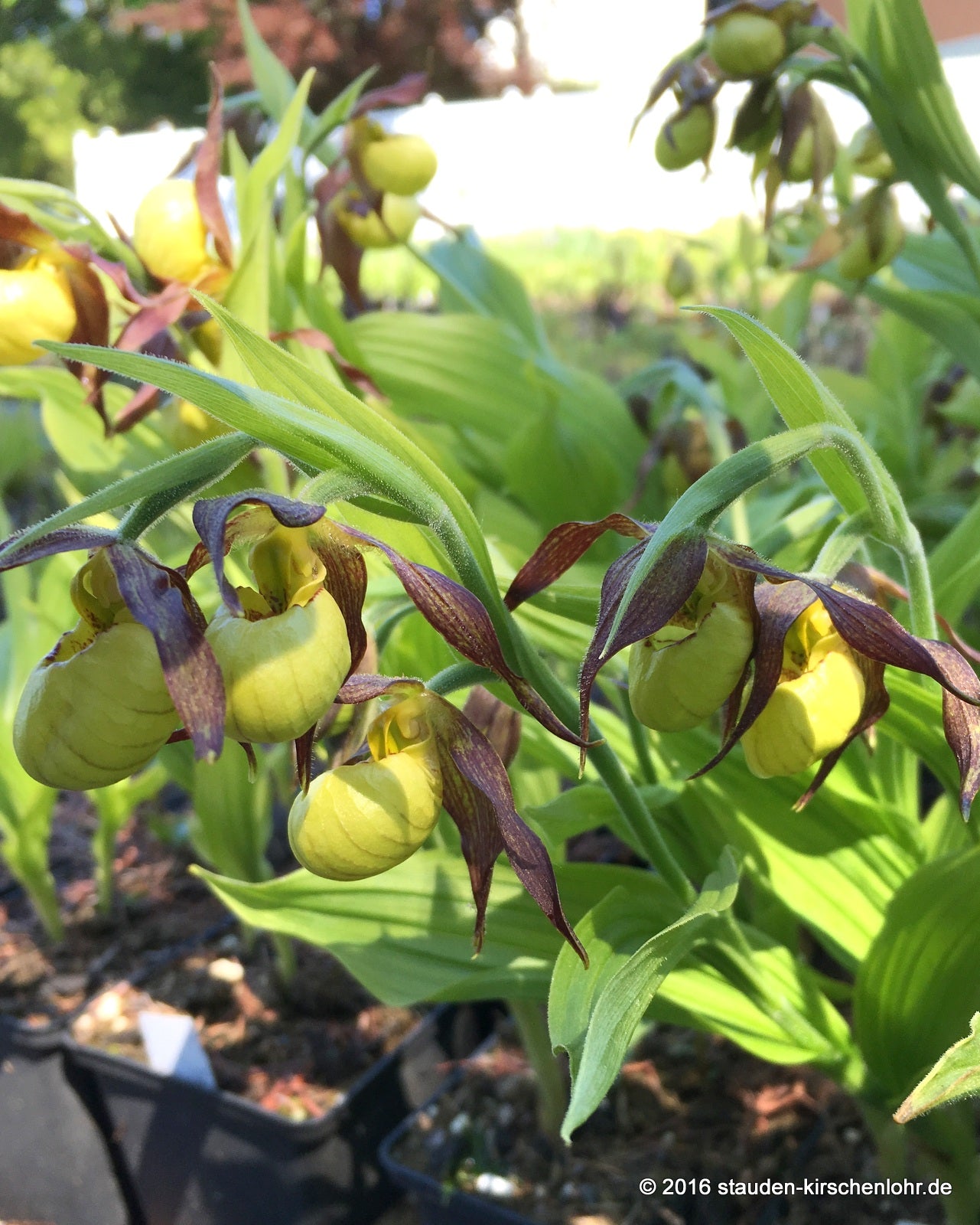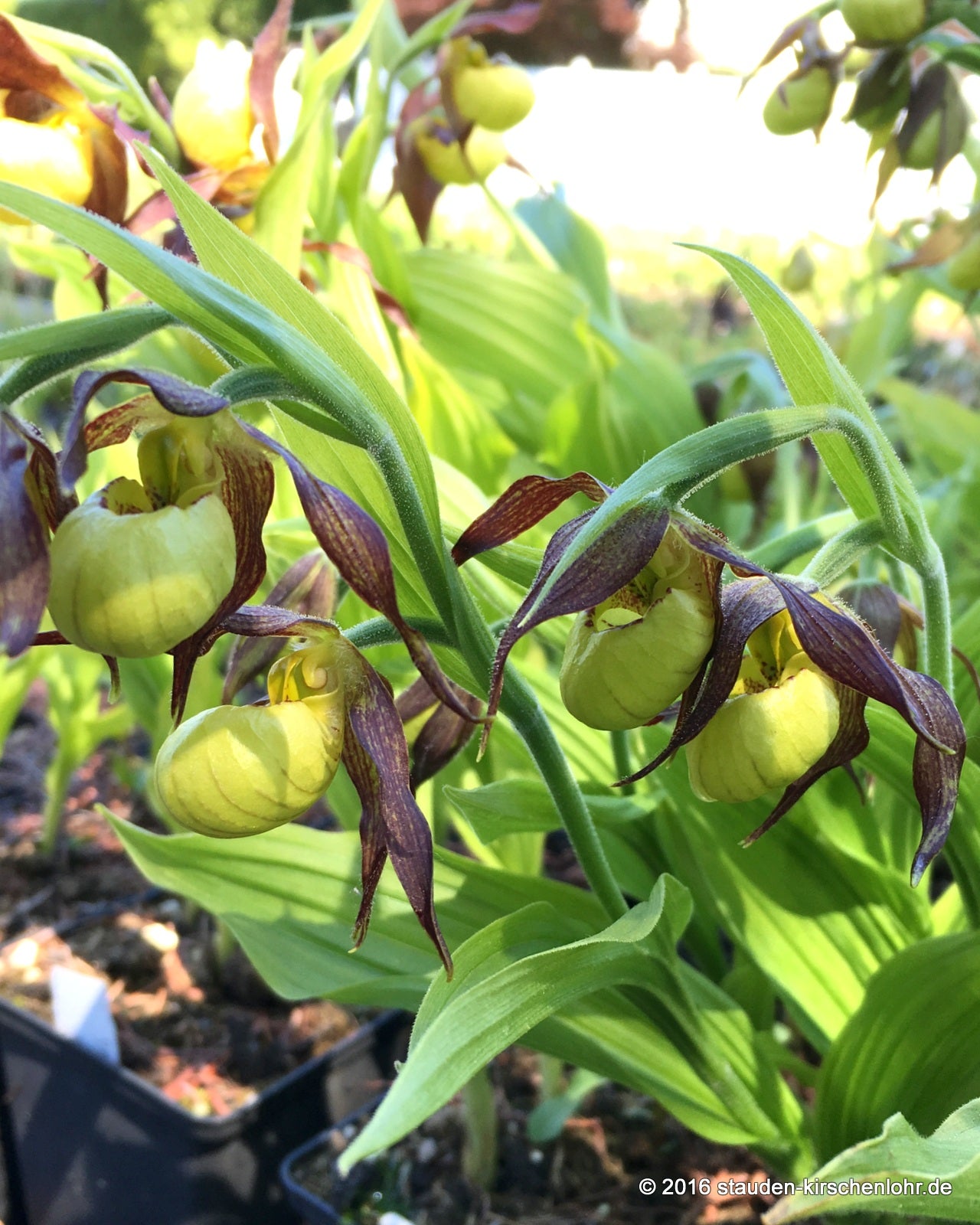 Goldgelber Schuh und mahagonibraune, leicht purpur schimmernde Sepalen und Petalen. Die Petalen sind gedreht. C. parviflorum x henryi
