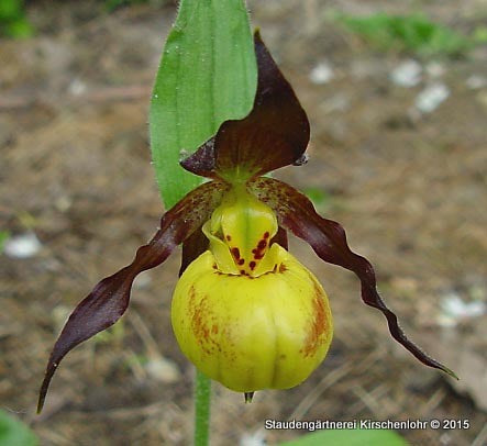 Sattgelber Schuh, innen rot bis purpur gefleckt und braune Sepalen und Petalen. Die Petalen sind stark gedreht; an der Basis oft grünlichgelb gestreift. Breitlanzettliches Laub.