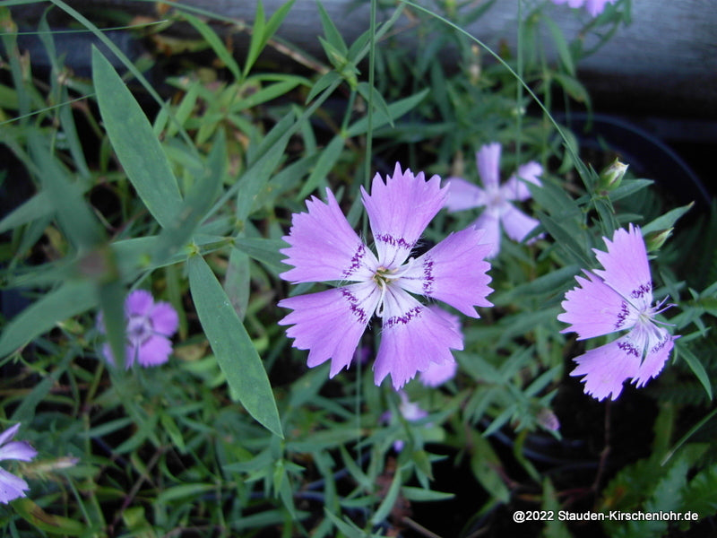 Kräftig violettrosa Blüten mit dunkler Mitte, an drahtigen Stängeln. Lineallanzettliche, graugrüne Blätter. Für Steingärten und auf Trockenmauern geeignet.