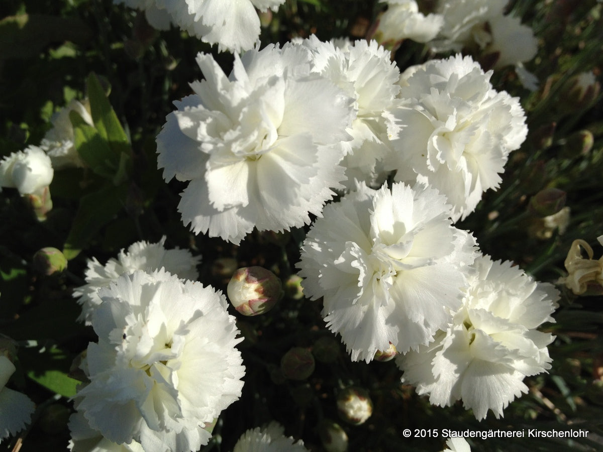 Neue englische Züchtung mit reinweißen, halbgefüllten Blüten. Silbergraues Laub. Sehr gute Winterhärte.
