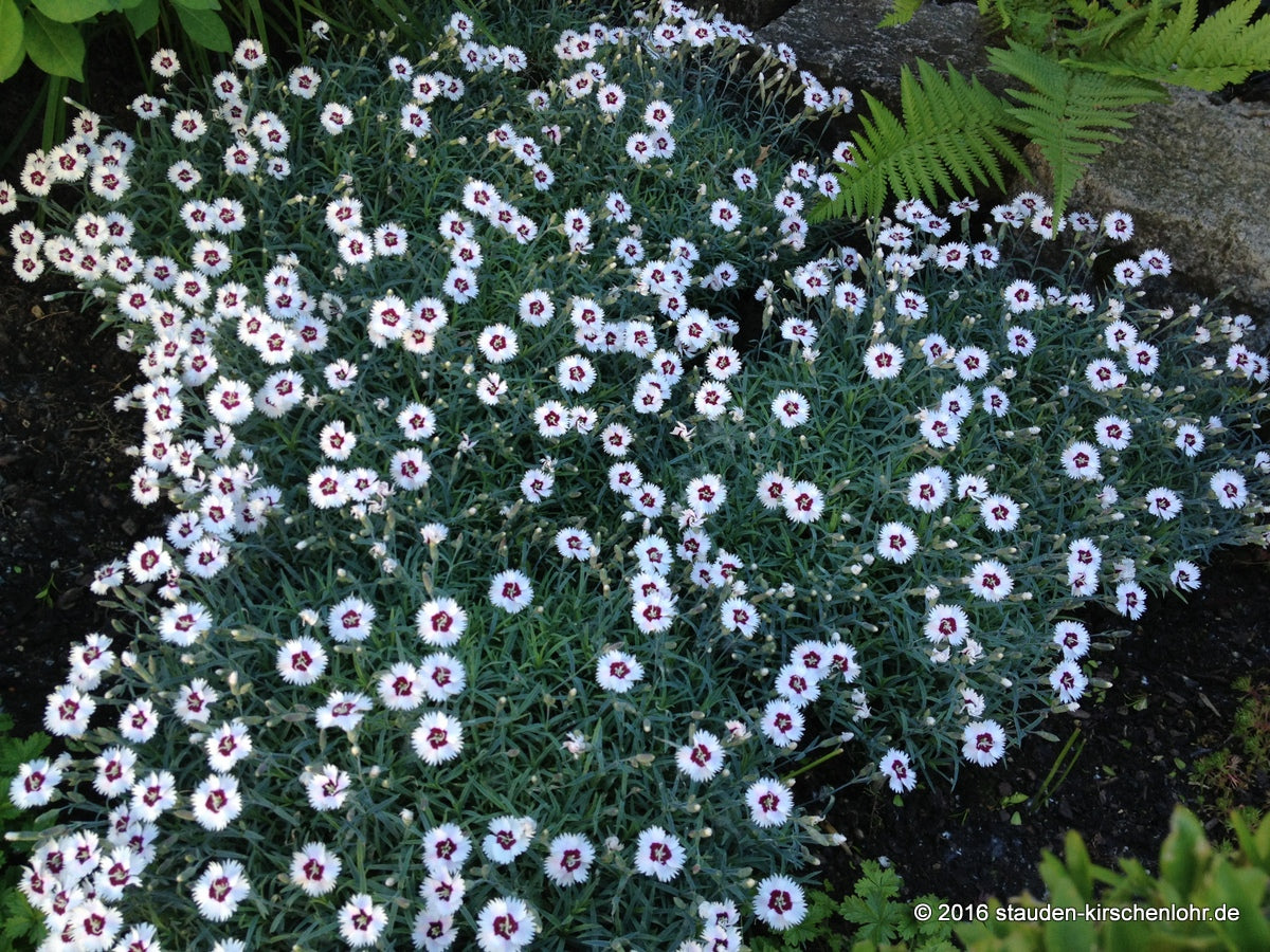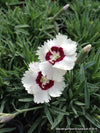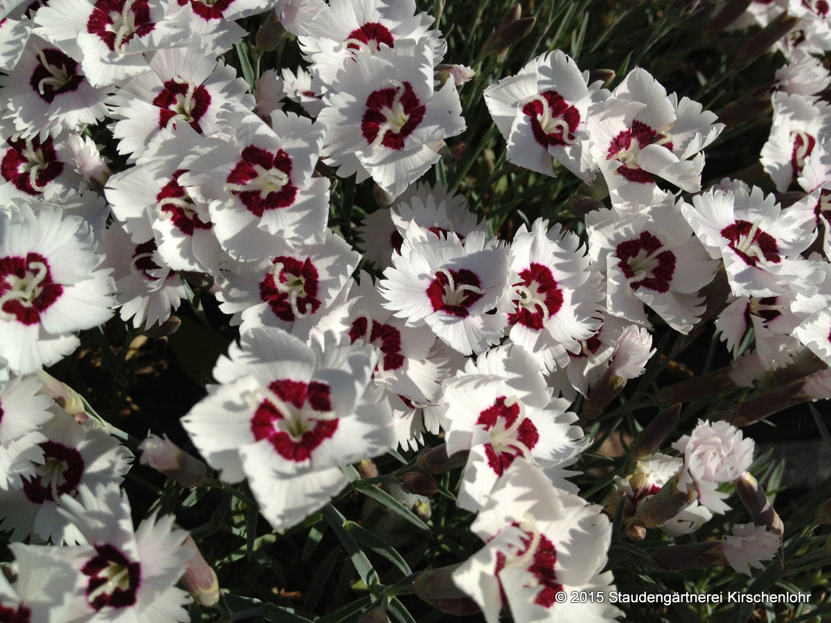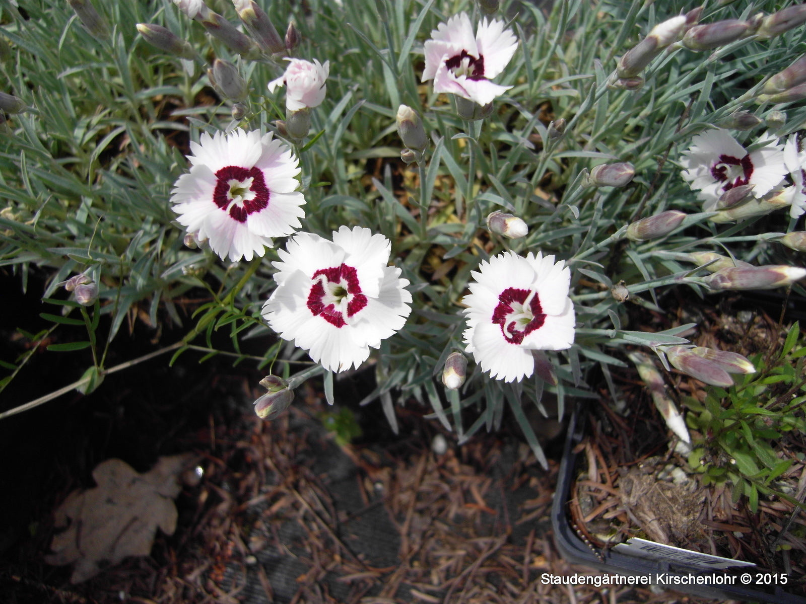 Zweifarbige Blüten; reinweiß mit weinrotem Auge. Silbergraues Laub. Sehr gute Winterhärte. Züchtung aus England.