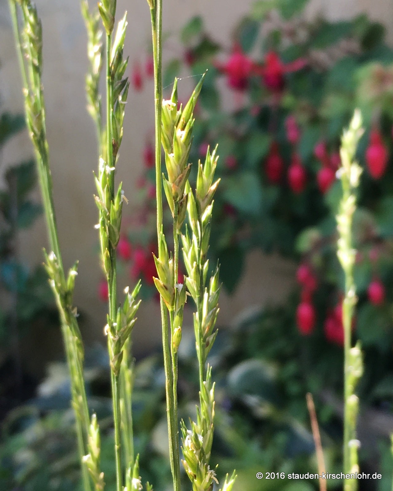 Schmale, hellgrüne Blütenrispen. Attraktiver, straff aufrechter Wuchs; schmales, riemenföriges, spitz zulaufendes, glänzendes Laub.