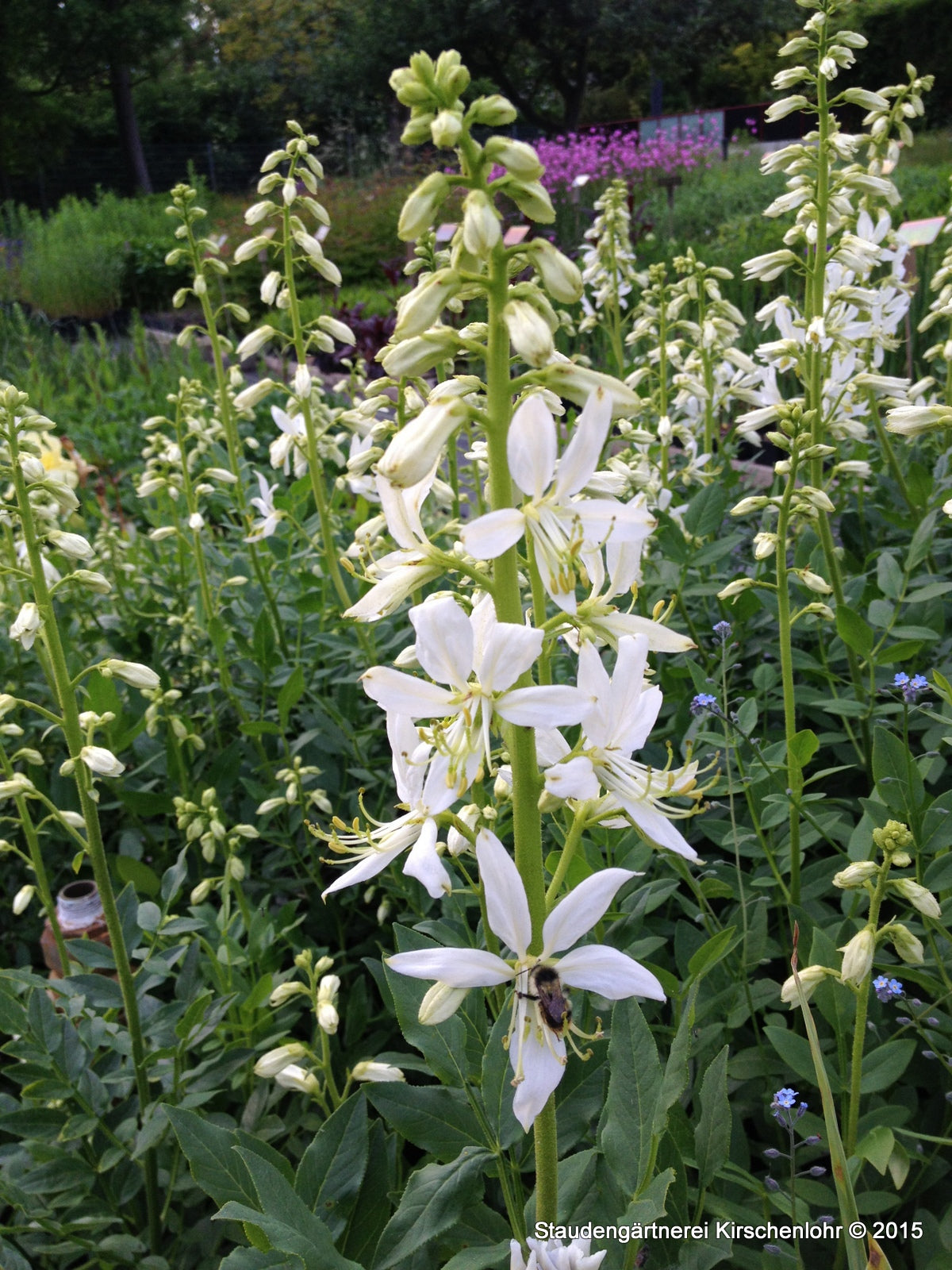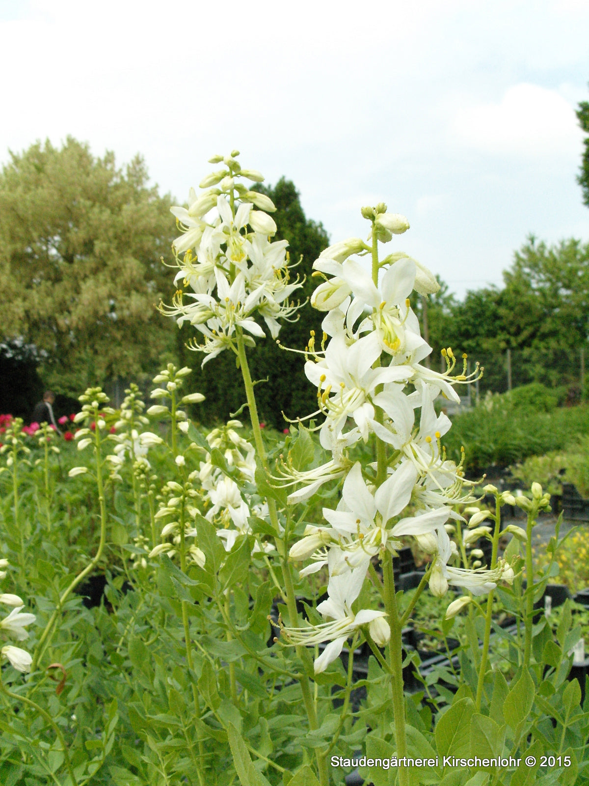 Reinweiße Blüten an einer aufrechten Blütentraube. Oval bis eiförmig, gefiedertes Laub. Sehr langlebige, kalkliebende Staude. Sommergrün. Hautkontakt vermeiden!