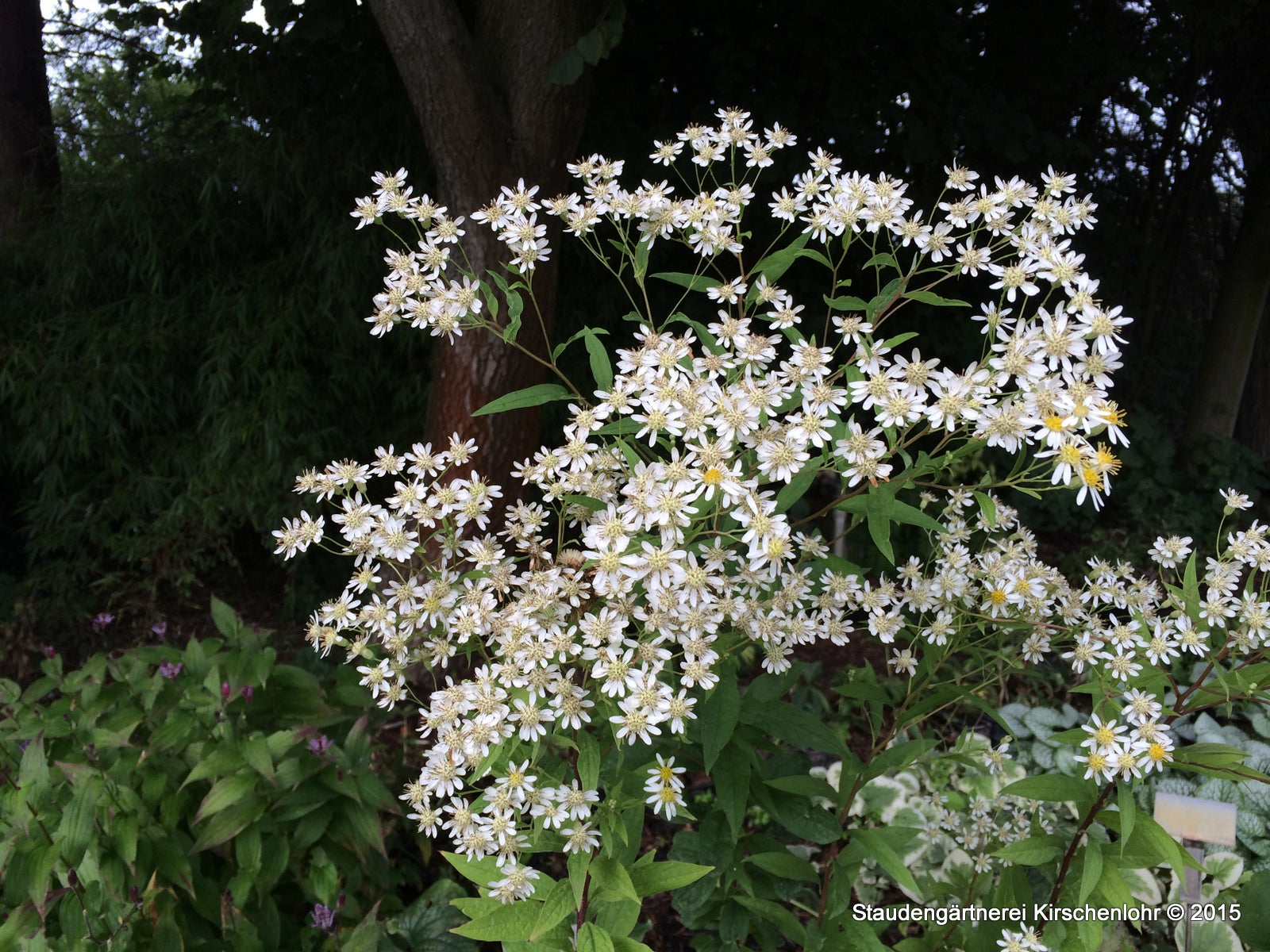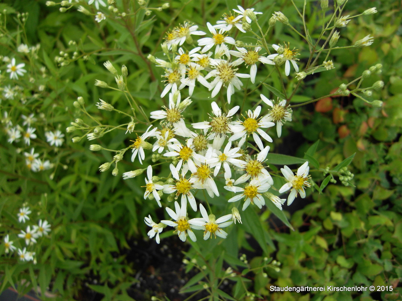 Wenig bekannte Wildaster mit weißen kleinen Asternblütchen. Sehr reichblütig. Rötliche Stängel im Herbst. Ausgezeichnet Standfest. (syn. Aster u. 'W. Sch.')