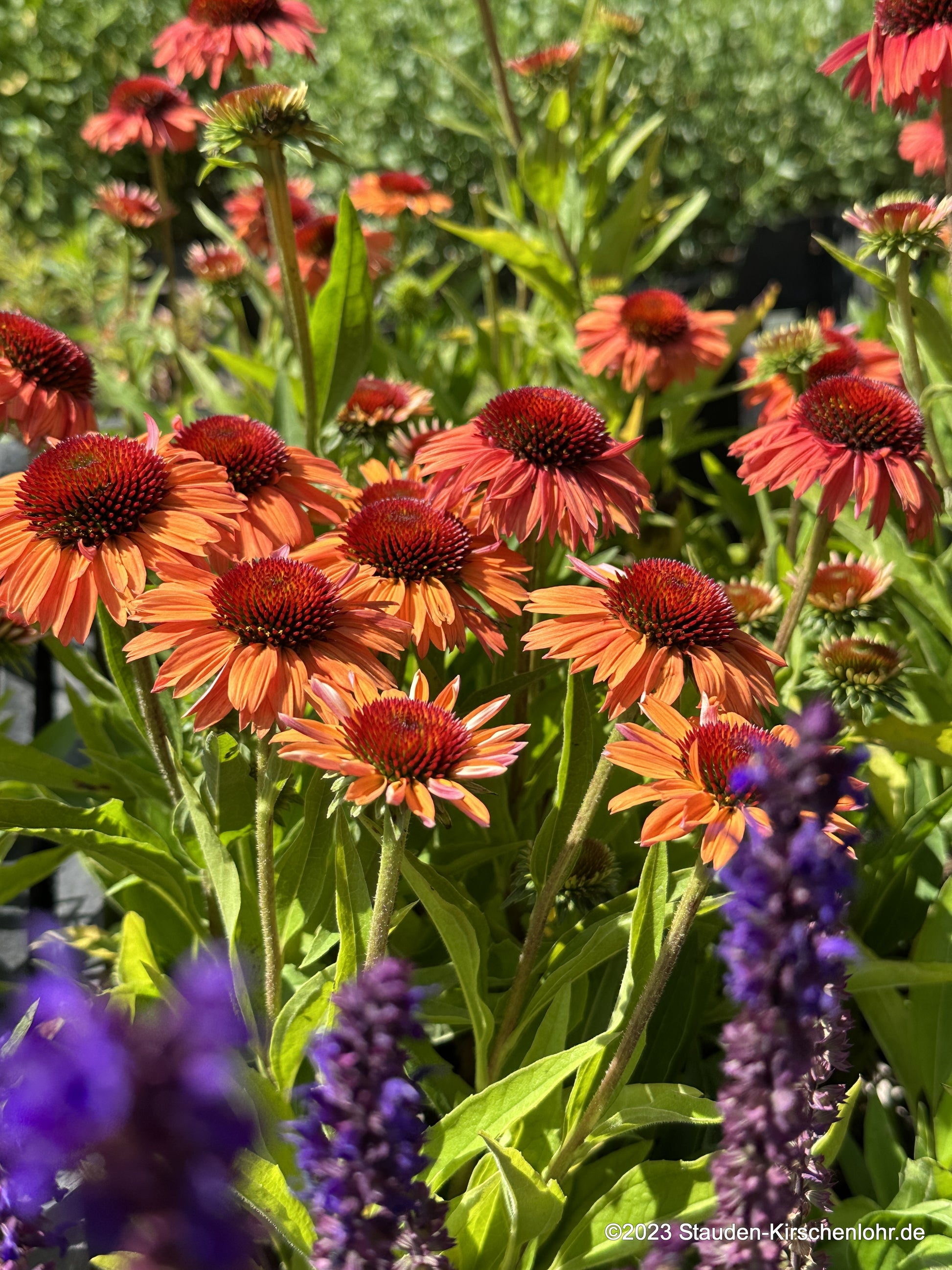 Strahlendes leuchtendorange. Fernwirkung. Niedrig in der Endhöhe; gut verzweigt. Reichblütige, Spitzenssorte. Schmale, leicht behaarte Blätter. Von Marco van Noort (NL).