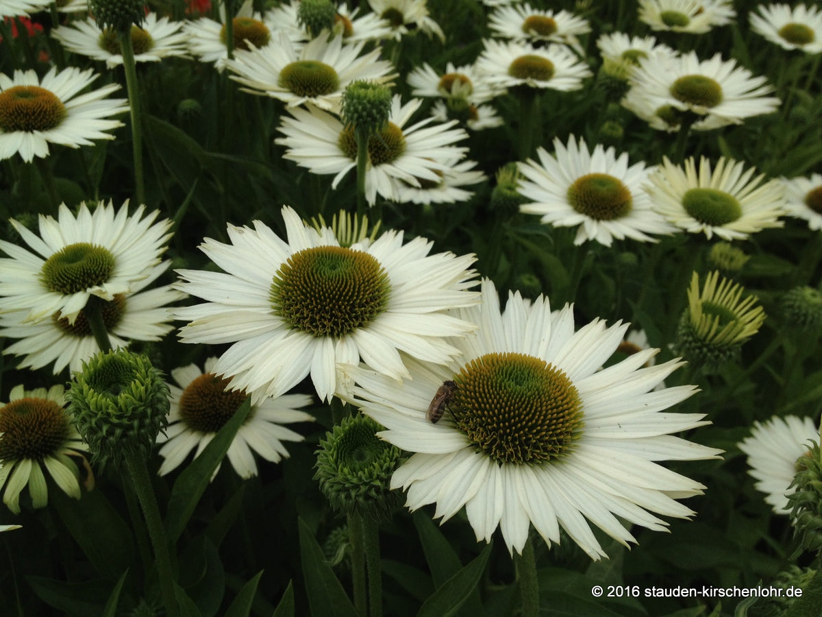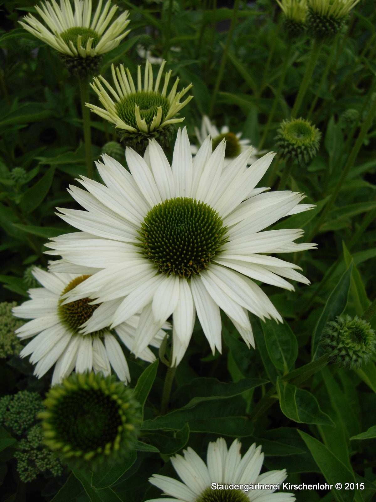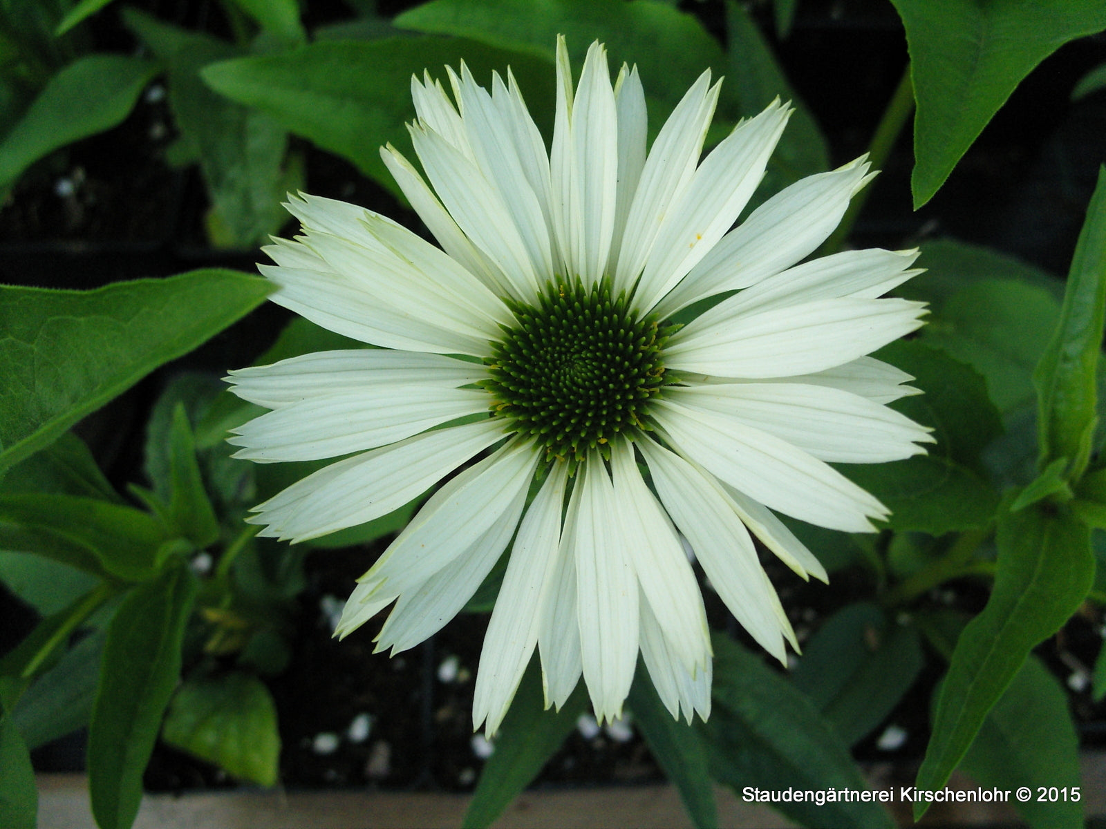 Große reinweiße Blüten. Die Blütenblätter stehen waggerecht und sind zweireihig angeordnet. Grünlicher Blütenboden. Zuverlässige Sorte.