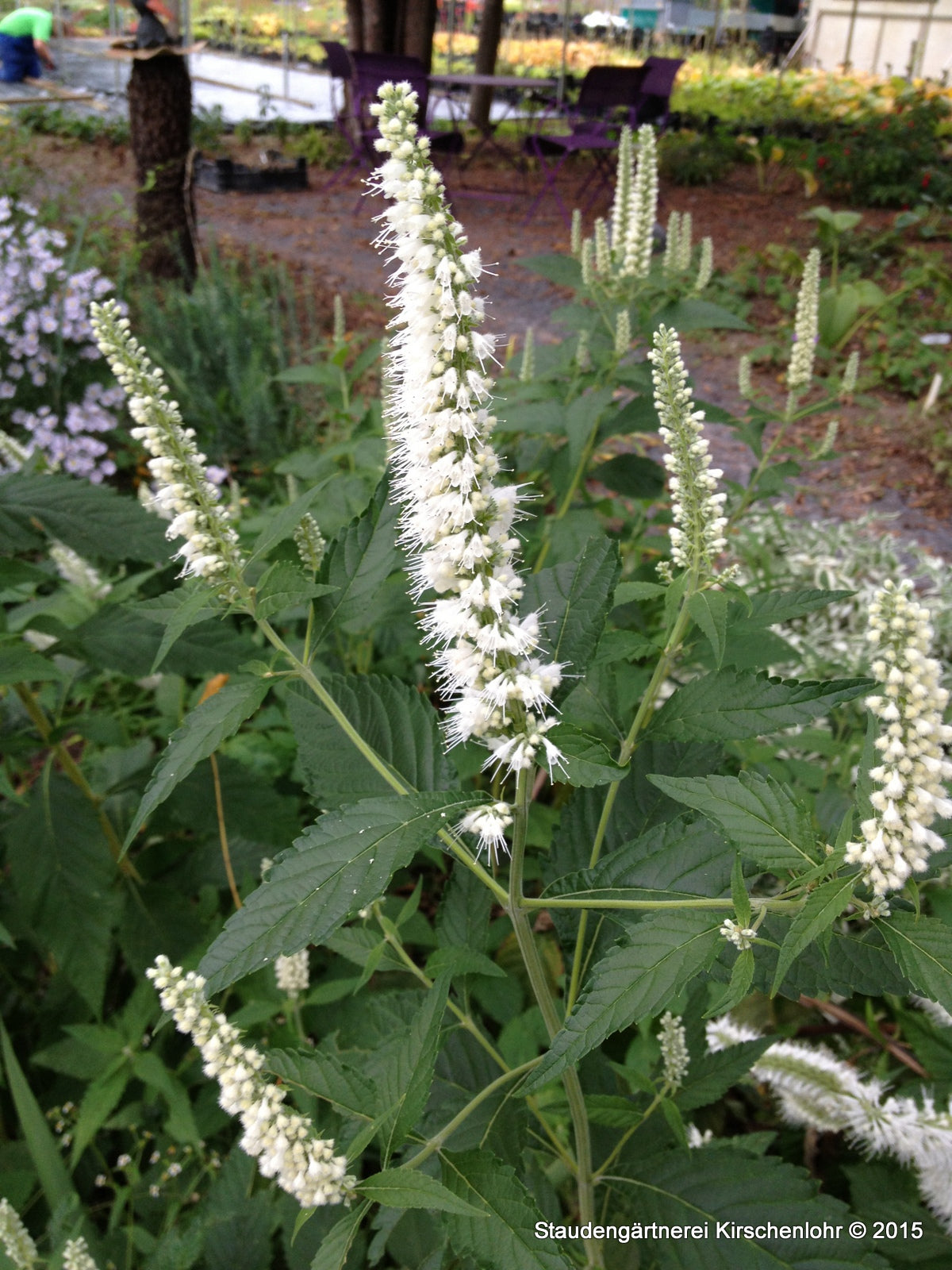 Weiße Lippenblüten, stehen in dichten Rispen. Aufrechter, verzweigter Wuchs. Lanzettliche Blätter mit grob gesägtem Rand. Herbstfärbung. Selten!