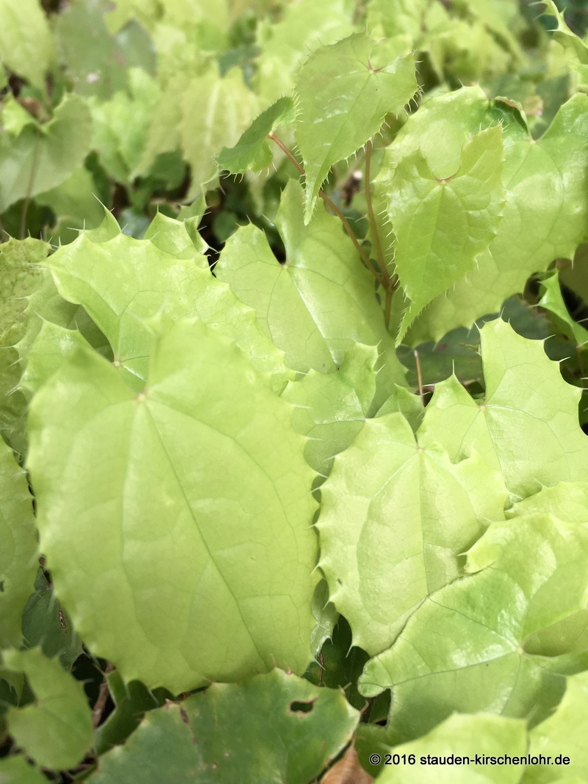 Spinnenartige, weit geöffnete, gelbe Blüten, in lockerer Traube. Immergrünes Laub mit toller braunroter Winterfärbung. Seltene Art aus Sichuan (China).