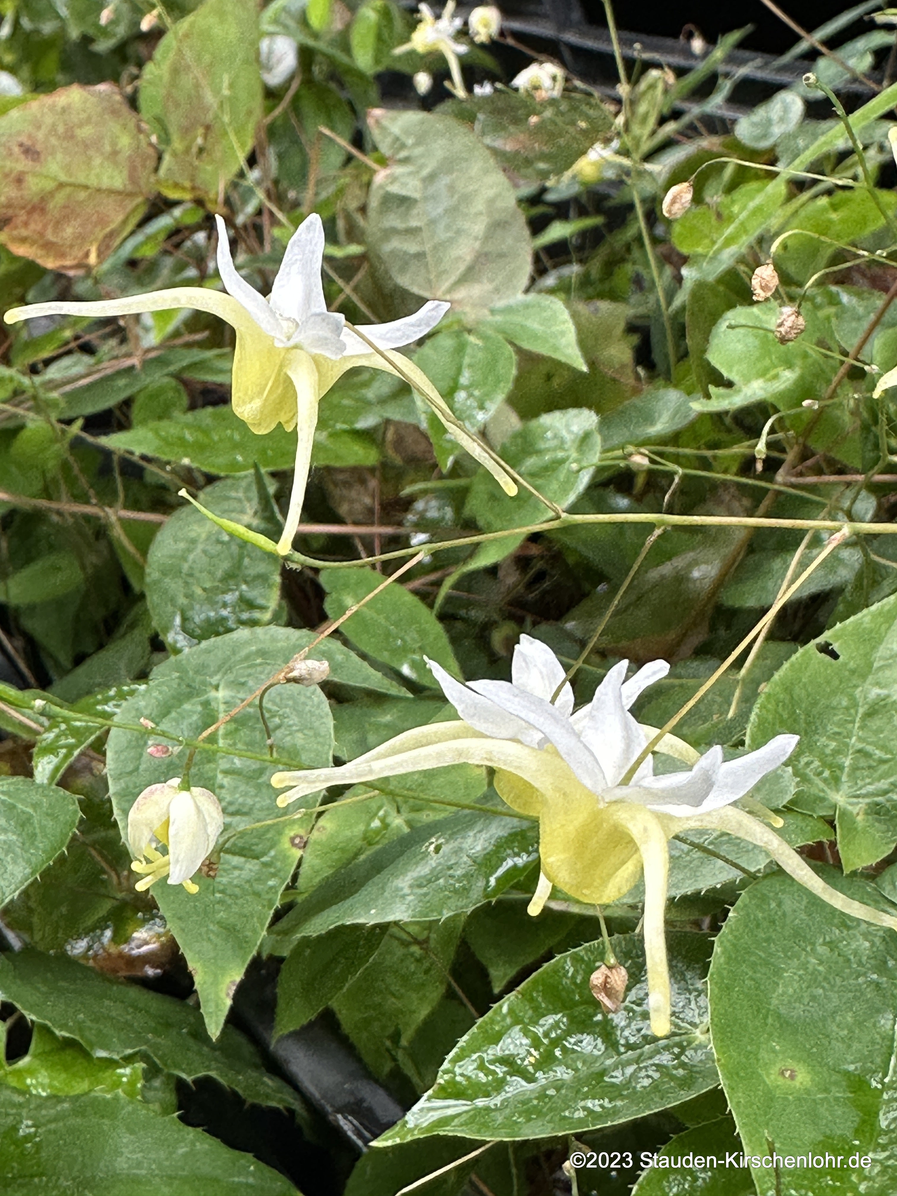 Kreuzung zwischen Epimedium x 'Shikinomai' x Epimedium membranaceum. Anmutige und üppige Blüten in Weiß und Gelb. Immergrün.