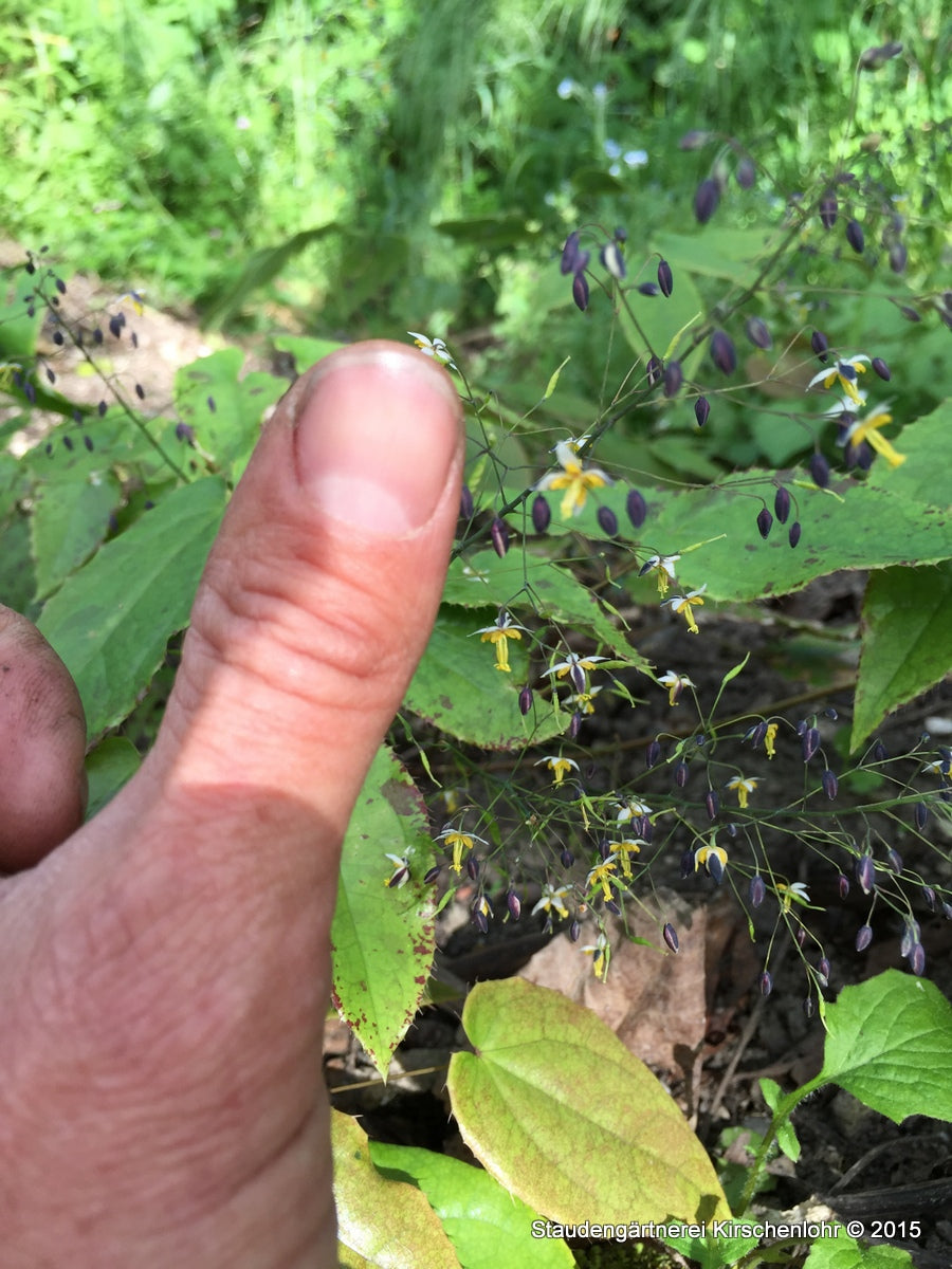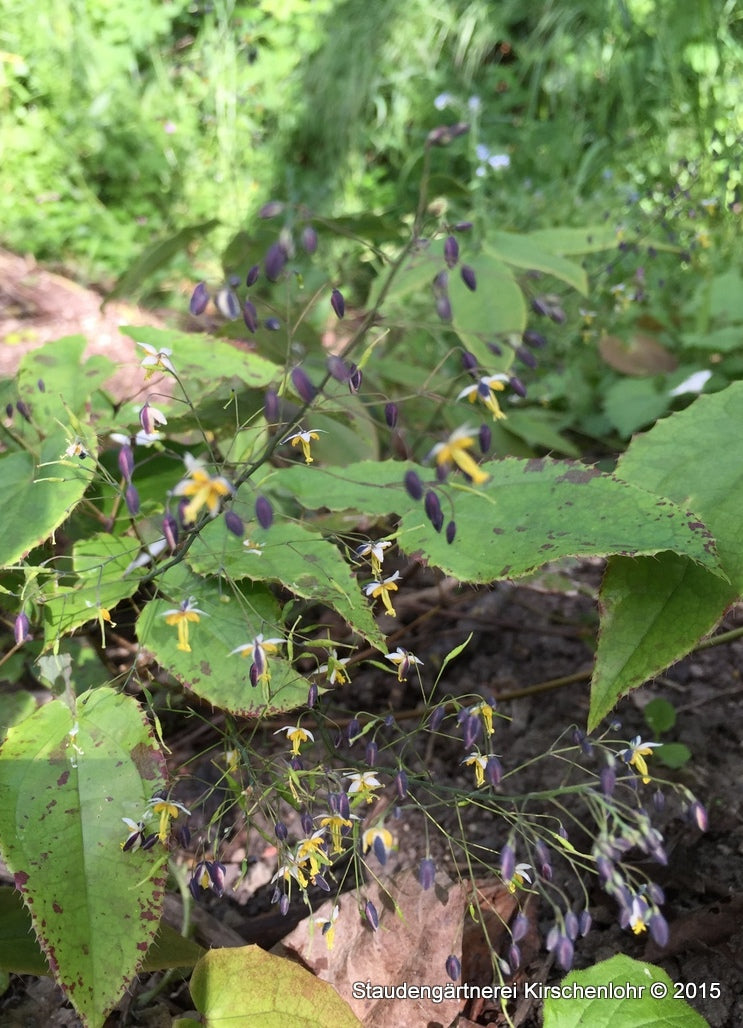 Wunderschöne, winzige Blütchen öffnen sich aus bläulichen Blütenknospen. Cremeweiße Hüllblätter, gelbliche Petalen. Große, lockere Blütentrauben an lange Stängeln. Blätter im Austrieb braun gefleckt. Seltene immergrüne Art aus Japan.