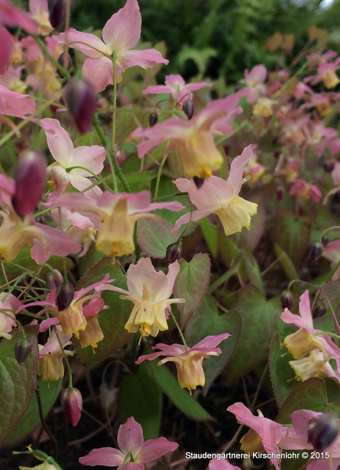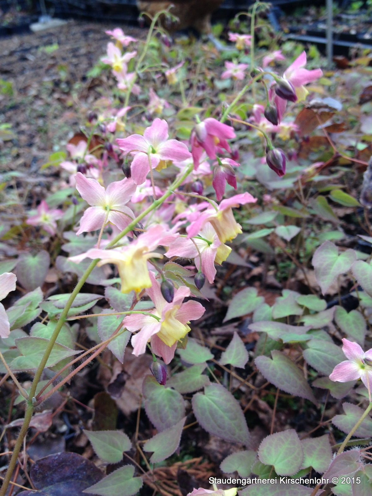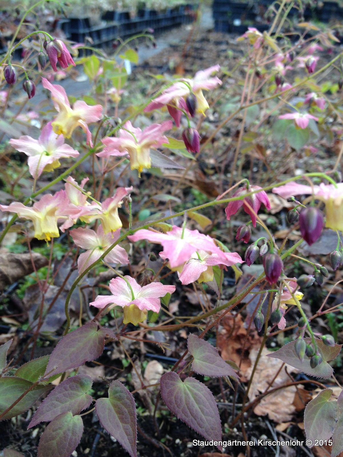 Altrosa Sepalen und hellgelbe Petalen. Die Blüten präsentieren sich in lockeren Trauben. Rotbraun gezeichneten, herzförmige Blätter im Austrieb. Wintergrün. (E.grandiflorum x E. pinnatum ssp. colchicum)