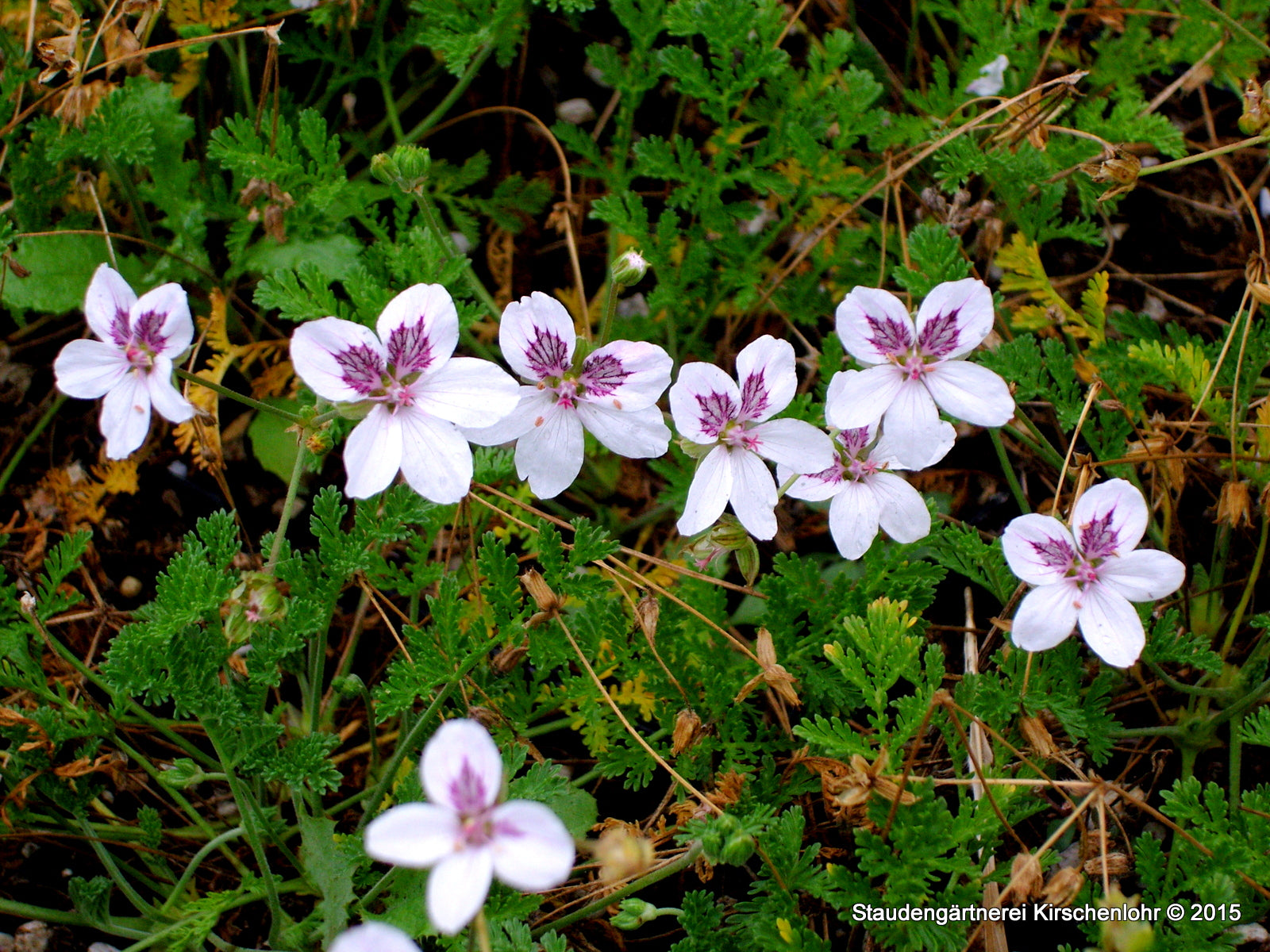 Reinweiße Blüten auf kurzen, verzweigten Stängeln. Dunkle Basalflecken an den zwei oberen Petalen. Grüne, fiederschnittige Blätter. Wintergün.