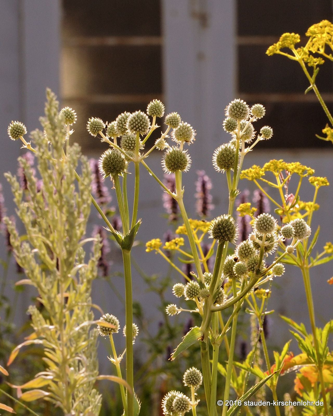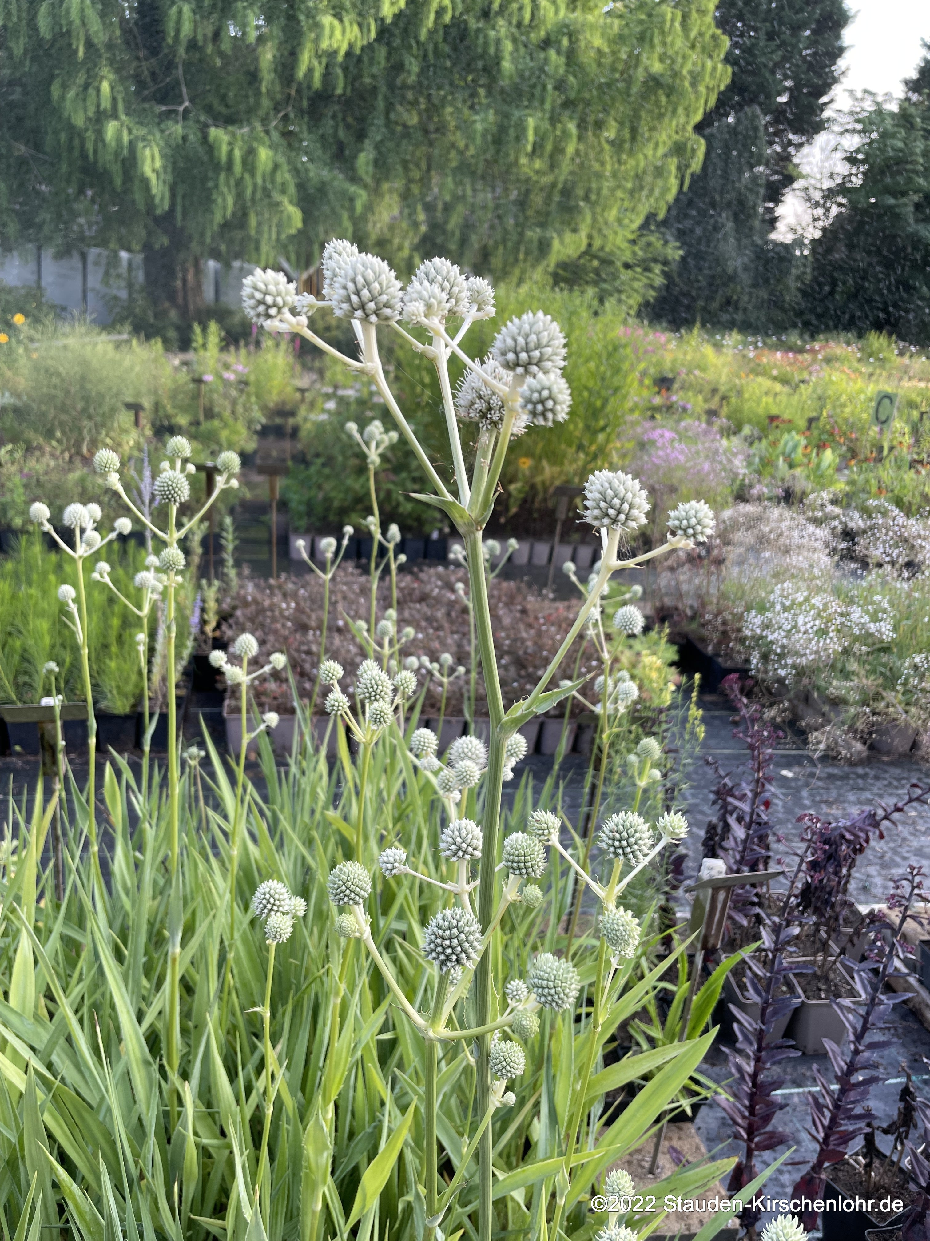 Starre, verzweigte Blütenstände mit zahlreichen halbkugeligen, grünlich-weißen Köpfen ohne Hüllblätter. Matte, lineale Blätter mit dornig gezähntem Rand.