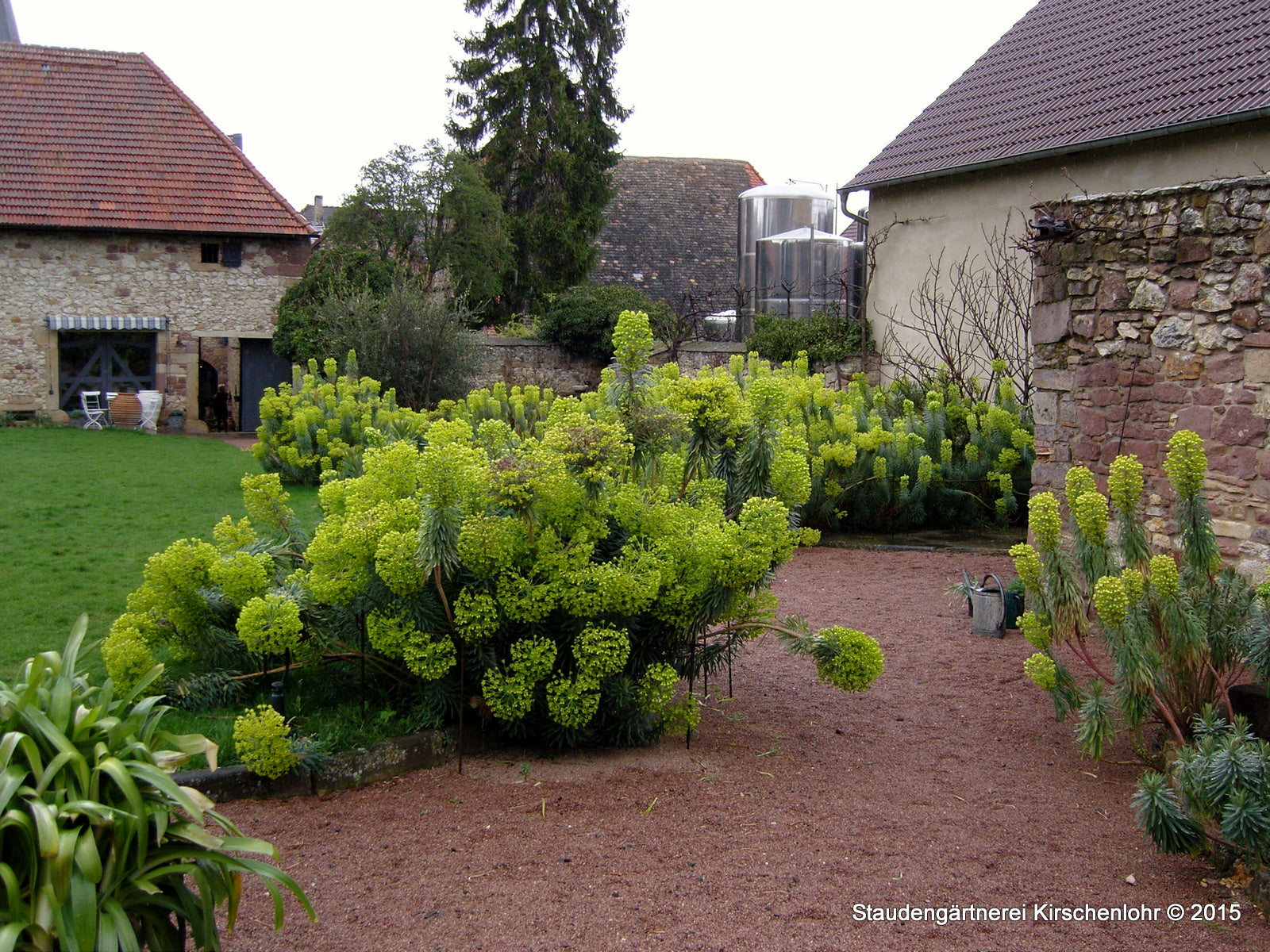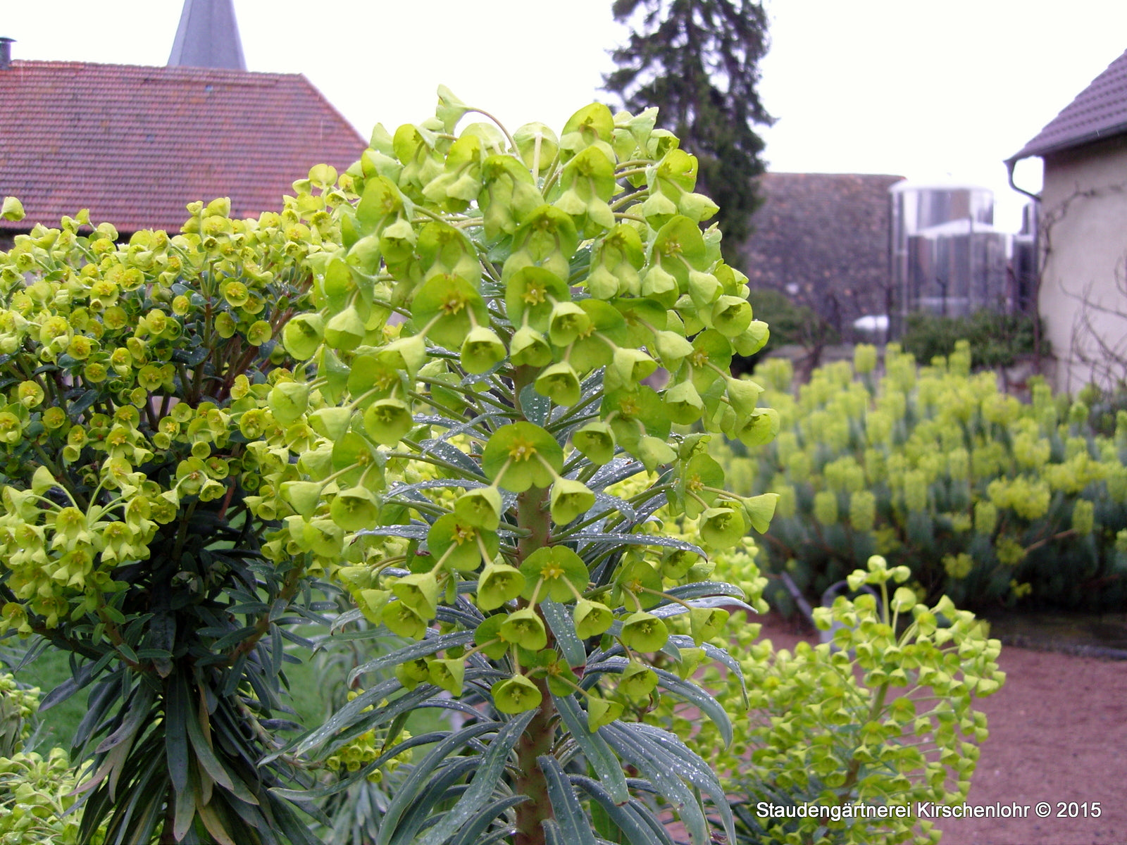Auffallend schöne, gelbgrüne Hochblätter und schwarze, perlenartige Nektardrüsen. Kompakte Auslese mit graublauen, lineale Blätter. Immergrün.