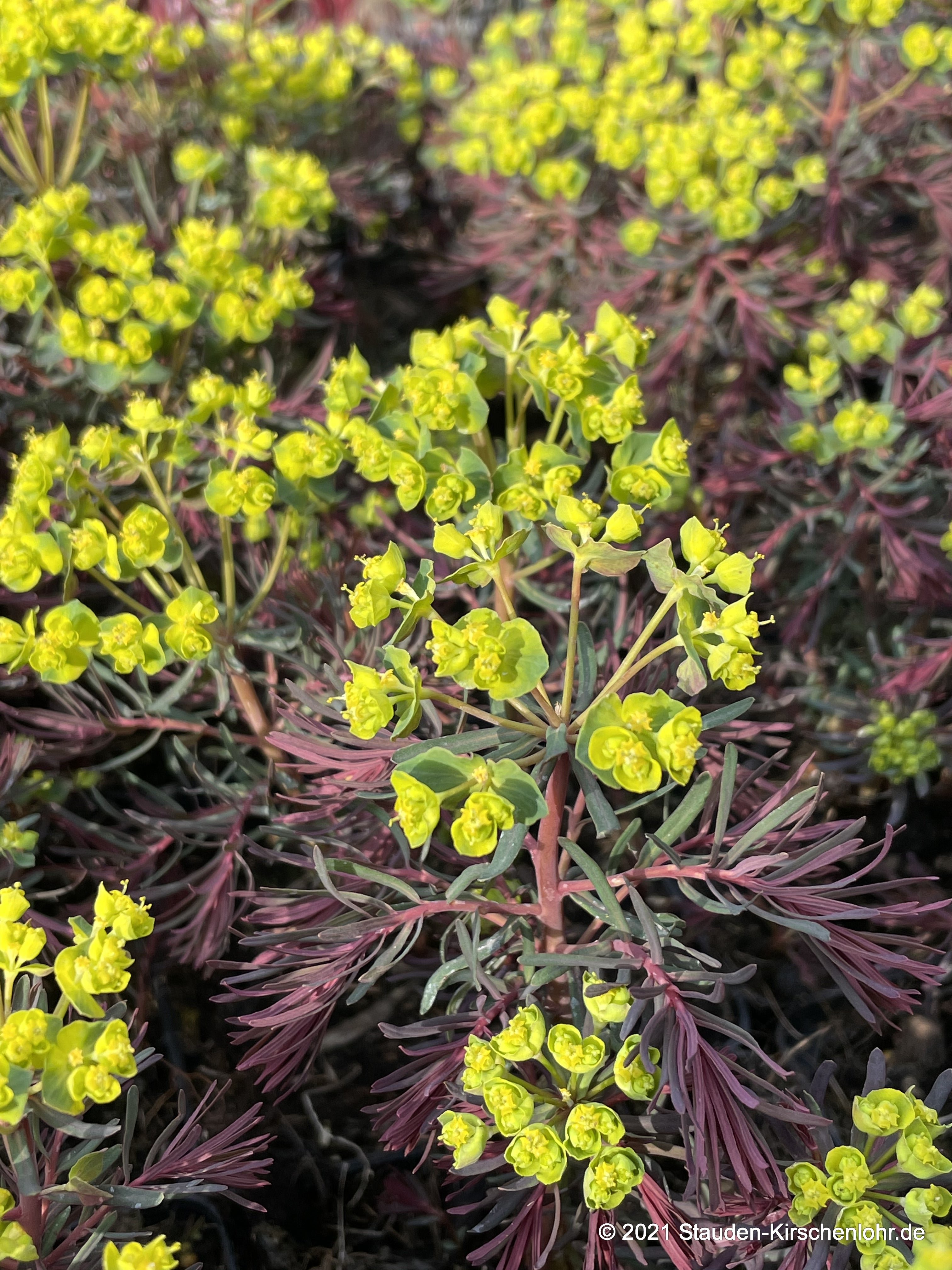 Intensiv gelbe Blüten mit grünlich-gelben Hochblättern. Nadelartige, graugrüne Blätter; im Austrieb purpurrot. Ausläufer! (syn. E. c. 'Clarice Howard').
