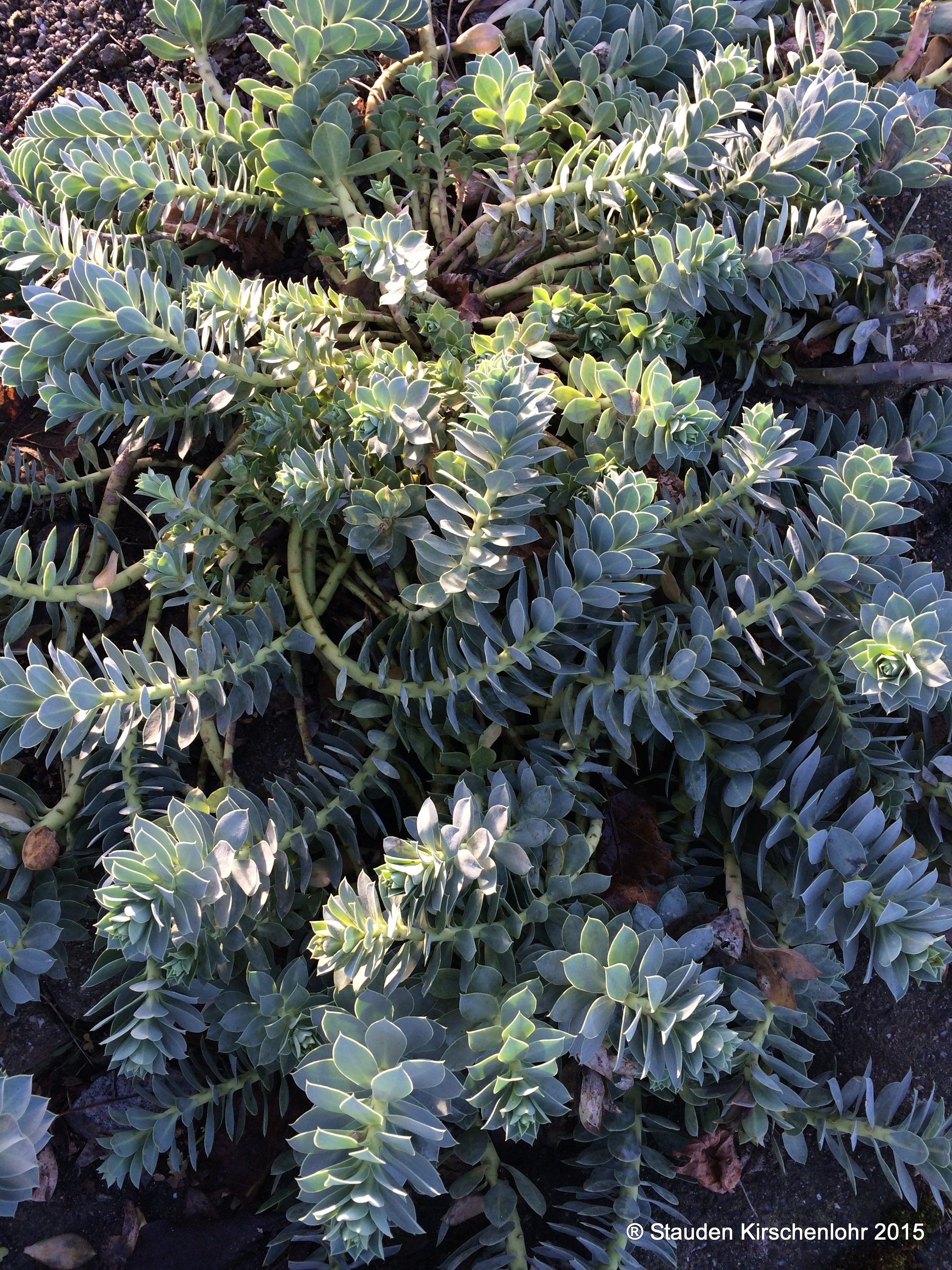 Gelbe Blüten mit grün-gelben Hochblättern. Niederliegende Triebe. Diese sind dachziegelartig beblättert; walzenförmig. Blätter blaugrün und zugespitzt. Immergün