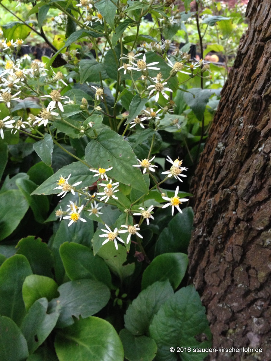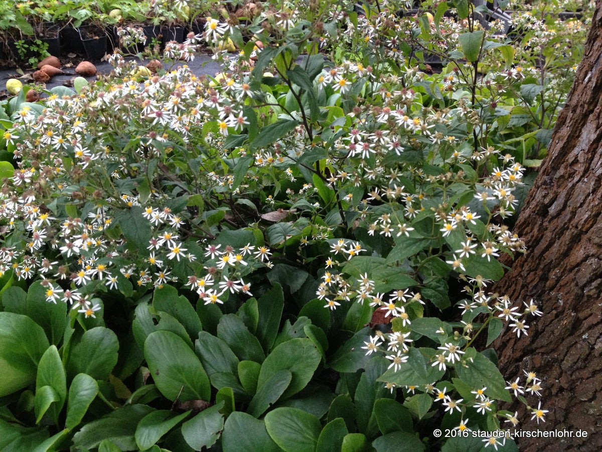 Hübsche, weiße Sternblüten auf dunklen, drahtigen Stielen. Sehr reichblühend. Aufrechter bis leicht lagernder Wuchs. Toleriert Wurzeldruck. syn. Aster divaricatus 'T.' Selektion von Dr. Hans Simon.