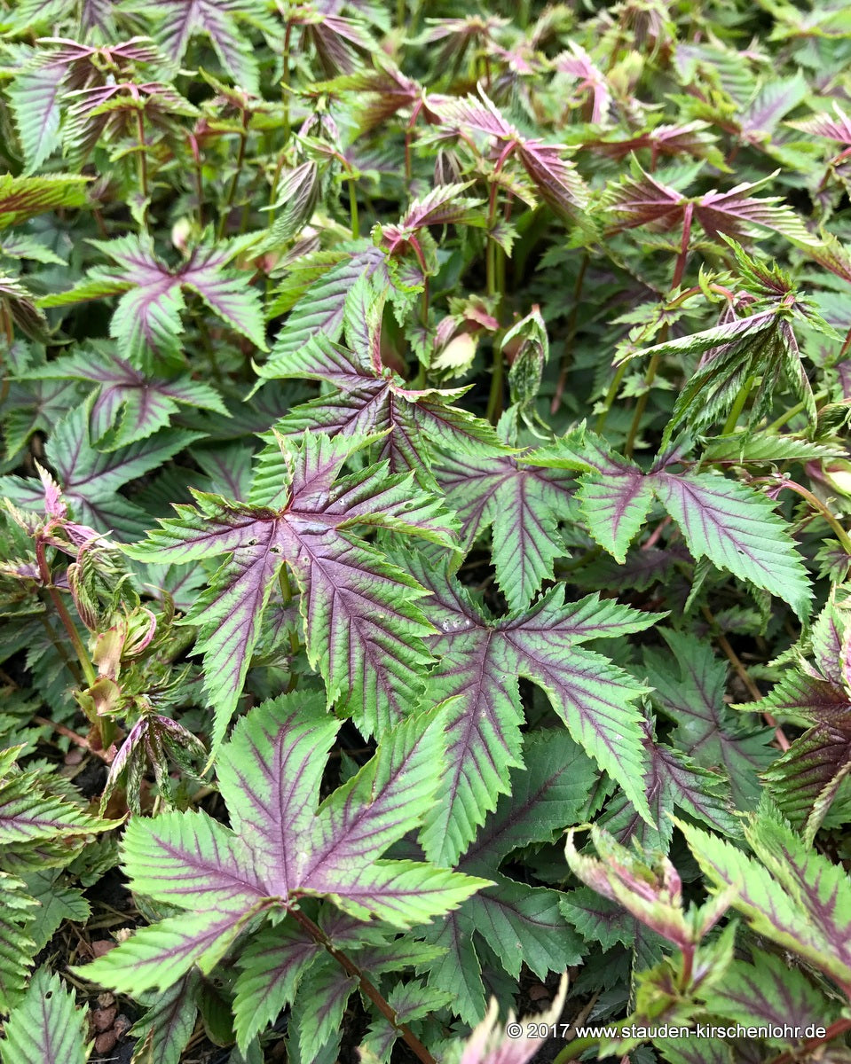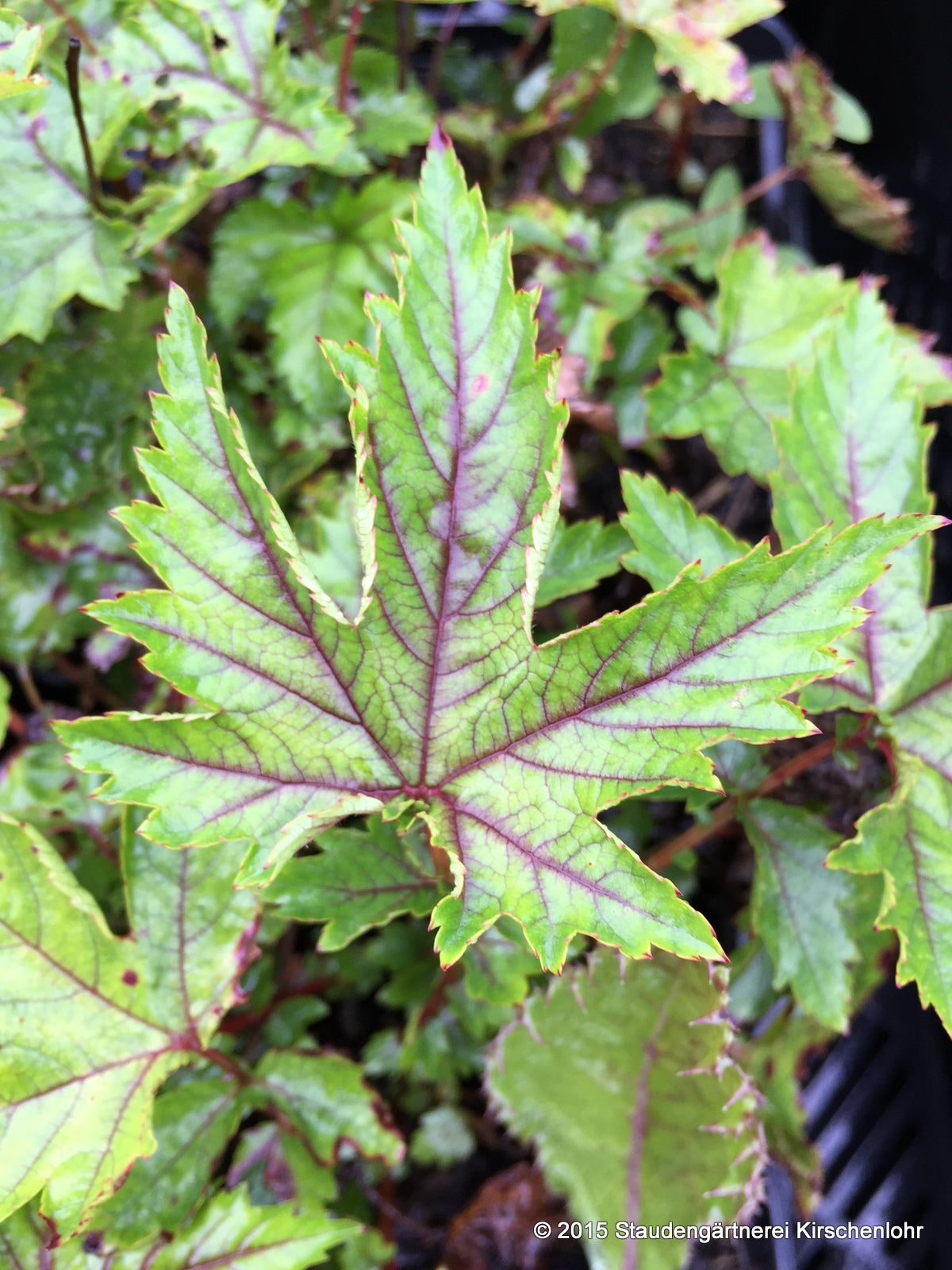 Dunkelrosa Blütenrispen. Breitlanzettliche Blätter in unterschiedliche Segmente geteilt. Blattadern weinrot gefärbt. Hybride aus F. multijuga und F. digitata. Von Yohei Hosogai (Japan).