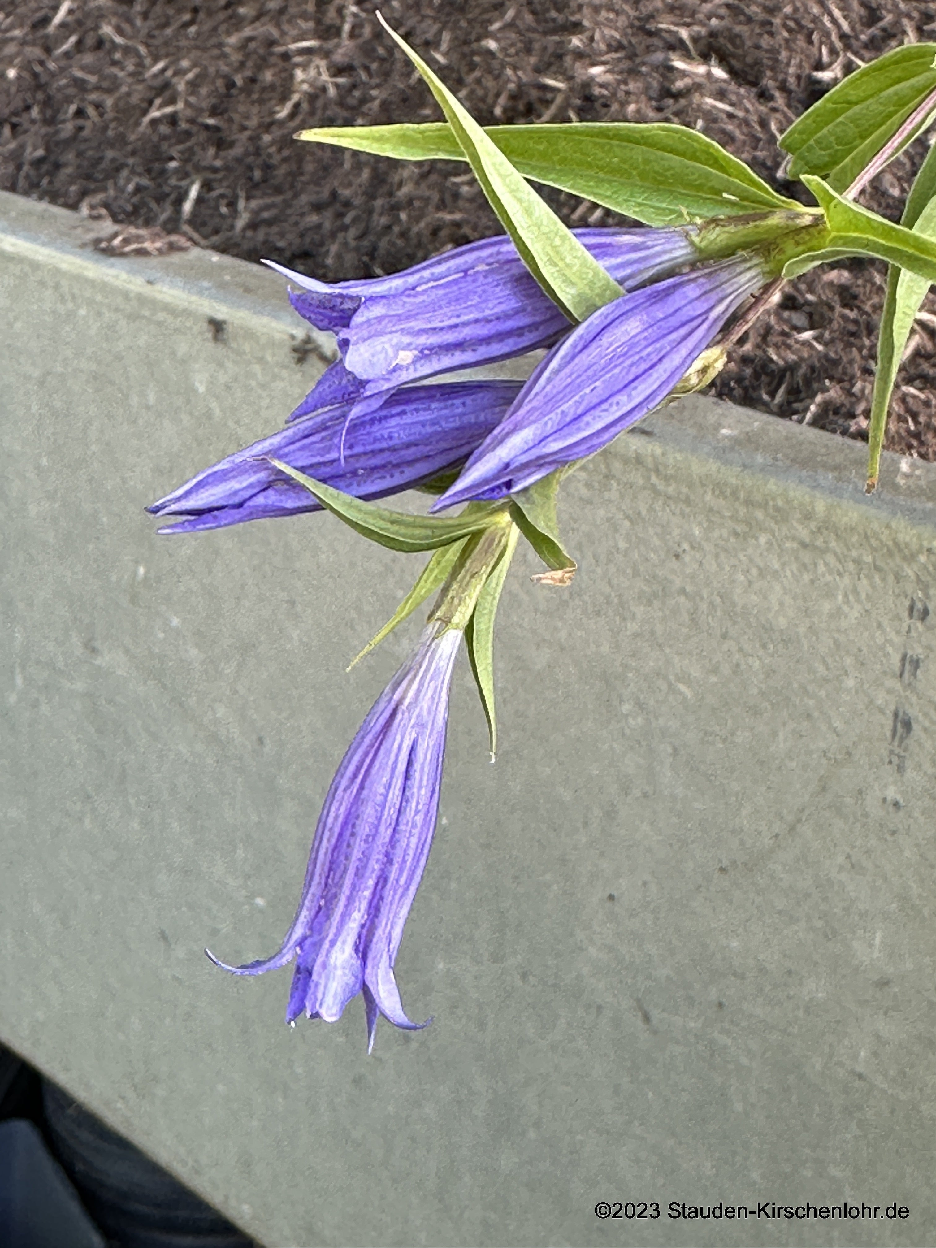 Tiefblaue (enzianblaue), trichterförmige Blüten mit weiß gezeichneter Innenseite. Lange übergeneigte, beblätterte Stängel. Lanzettliche Blätter. Wintergrün.