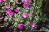 Purpurviolett mit schwarzem Auge und tief purpurfarbener Aderung. Ausladender Wuchs mit langen Trieben die sich in benachbarte Pflanzen "spinnen". Austrieb auffallend gelbgrün. Sommergün. (G. psilostemon x procurrens)